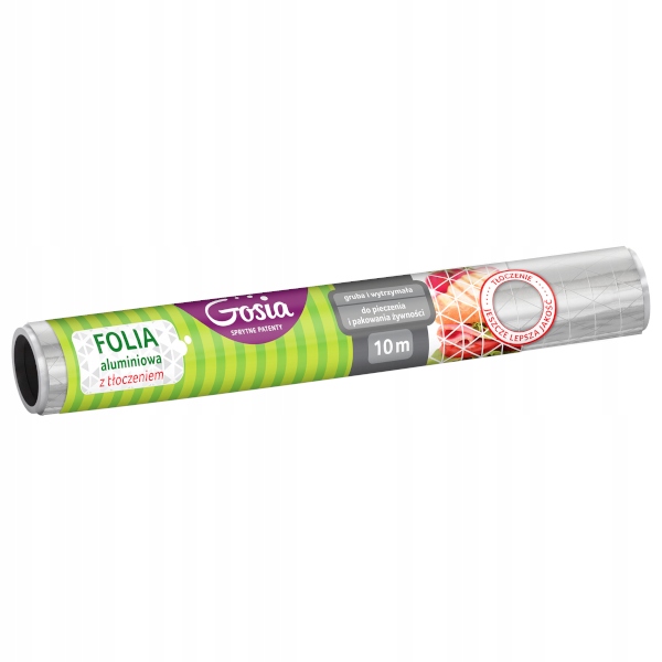 Алюмінієва фольга Gosia з тисненням стане в нагоді вам і вашим близьким для загортання бутербродів, продовження свіжості продуктів і навіть для заточування ножиць або фарбування волосся. У свою чергу Gosia найчастіше використовує його для загортання стебел бананів, що подовжує процес дозрівання.