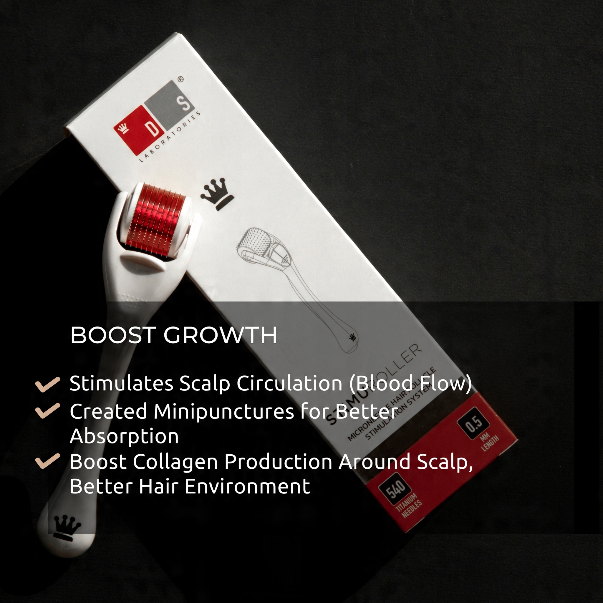 Ds Laboratories StimuROLLER — це пристрій, призначений для стимуляції кровообігу в шкірі для відновлення природної, молодої краси шкіри. Стимулюйте ріст здорового волосся, одночасно запобігаючи випаданню. Він складається з 540 титанових голок, які обережно проникають у шкіру, створюючи мікропроколи для вироблення колагену та еластину через шкіру. Завдяки голкам, які допомагають відкрити мікроканали в шкірі голови, Ds Laboratories Hair Roller покращує проникнення місцевих процедур на шкіру голови та обличчя, підвищуючи ефективність до 20 разів порівняно з нанесенням продуктів вручну.