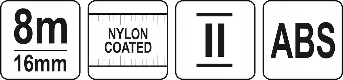 Рулонна рулетка зі сталевою стрічкою, виконана в II класі точності. Стрічка виготовлена зі спеціального гнучкого листового металу, покрита лаком і додатково захищена нейлоновим покриттям, яке захищає від вологи, стирання і вицвітання під впливом сонячних променів. Закінчується рухомим гачком /пристосований для внутрішніх і зовнішніх вимірювань/. Колір стрічки жовтий, по верхньому та нижньому краях нанесені міліметрові шкали. Компактний корпус із стійкого до механічних пошкоджень АБС-матеріалу, посиленого накладками з чорної гуми /TPR/ Мірка має два фіксатори подачі стрічки. Кнопка, розташована на основі, використовується для тимчасового блокування, а кнопка на передній частині корпусу постійно блокує стрічку при переміщенні. Для зручності користувача оснащений монтажним затискачем і коротким шнурком.