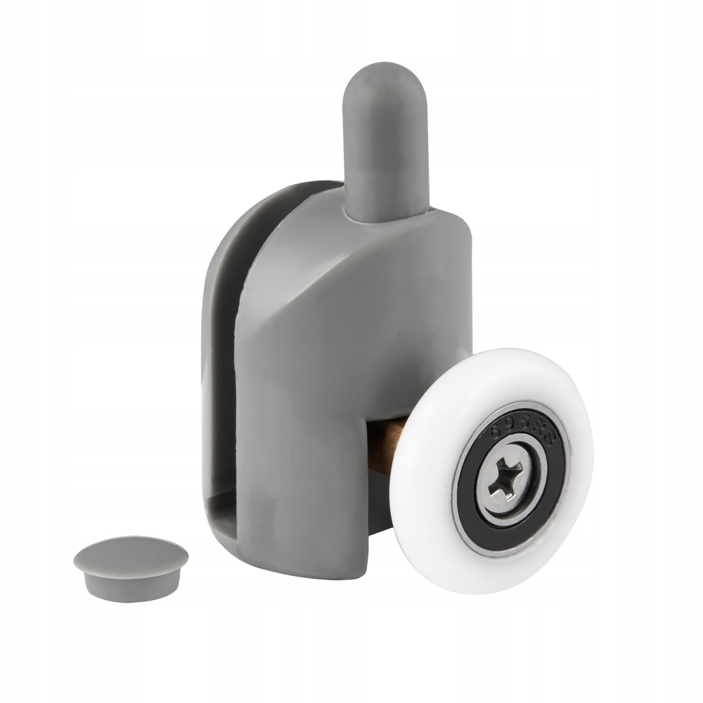 Нижні ролики для душової кабіни мають кнопку, яка дозволяє легко прикріпити скло до направляючої. Діаметр отвору в склі, який підходить для цього типу нижнього ролика, повинен становити 10-12 мм. Центр отвору має бути на відстані 19 мм від краю скла. Корпус цього ролика виготовлений з пластику підвищеної міцності - ABS. Кронштейн з нержавіючої сталі, на якому встановлено колесо, дозволяє відхилити підшипник від площини скла. В результаті це рішення дає можливість використовувати цей ролик для напівкруглої душової кабіни.