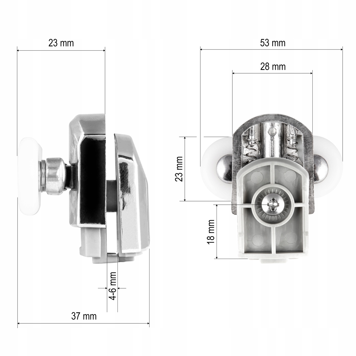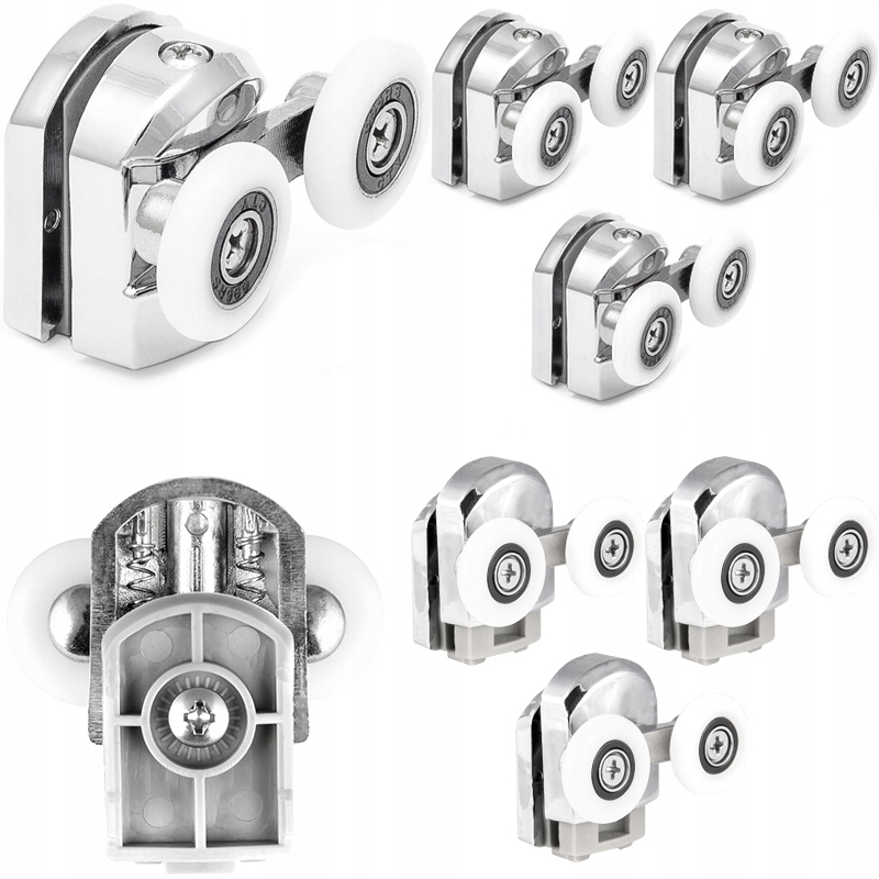 Подвійні хромовані верхні ролики є ідеальним вибором практично для будь-якої душової кабіни, забезпечуючи плавне та стабільне відкривання та закривання дверей. Для установки цих роликів отвір в склі душової кабіни повинен мати діаметр 11-14 мм, а центр отвору повинен знаходитися на відстані 18 мм від краю скла. Ролики оснащені колесами діаметром 23 мм. Завдяки регулювальному гвинту вони дозволяють установити скло дверей в ідеальне вертикальне положення, що забезпечує плавне відкриття і закриття дверей кабіни. Подвійні колеса забезпечують кращу стабілізацію скла в напрямній, що мінімізує ризик його перекидання, тому дверцята не блокуються під час використання. Завдяки регульованому кріпленню коліс ролики підходять як для квадратних, так і для напівкруглих кабін. Хромоване покриття не тільки додає елегантності, але й полегшує догляд за роликами в чистоті.