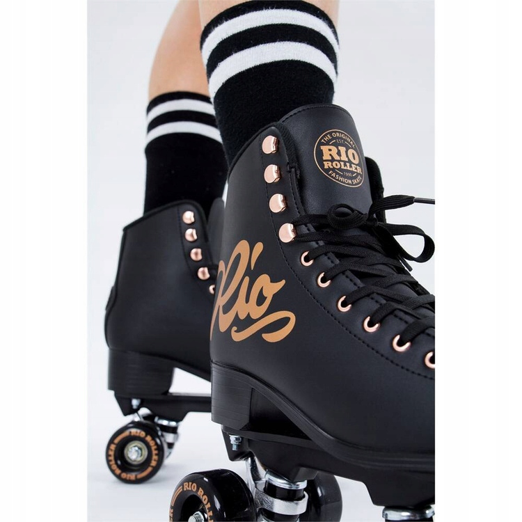 Популярна схема моделі сценарію була вдосконалена додаванням елегантності для верхньої частини та ефектом "рожевого золота". Малюнок з традиційних фігурних ковзанів, Rio Roller зберегла класичну кольорову палітру - чорну та крему. Ці роликові ковзани готові вдарити дискотеку та танцювати в ретро -ритмі!
