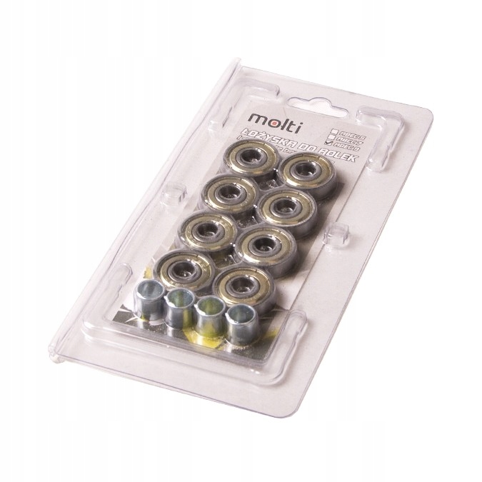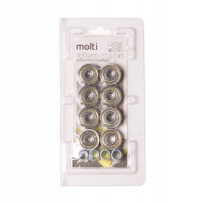 ABEC-9 Підшипники Molti виготовлені з високоякісної вуглецевої сталі, що забезпечує відмінну твердість і довговічність. Він характеризується низьким опором коченню, що означає вищу швидкість відповідно до стандарту ABEC Американського комітету з розробки кільцевих підшипників. Важливим параметром цього підшипника є ексцентриситет, тобто округлість на доріжці у внутрішньому кільці, і становить всього 0,0012 мм. Підшипник призначений для роликових ковзанів, скейтбордів і самокатів.