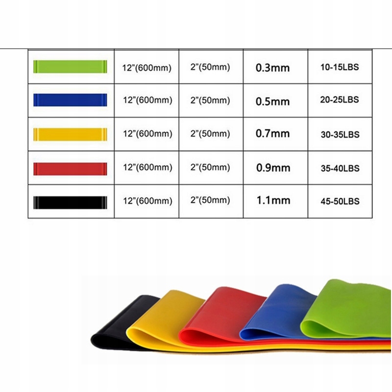 ✔️ 5 гімнастичних ремінців 3 різних розмірів гуми - кольорове кодування - Різні види товщини, від 03 до 1,1 см
