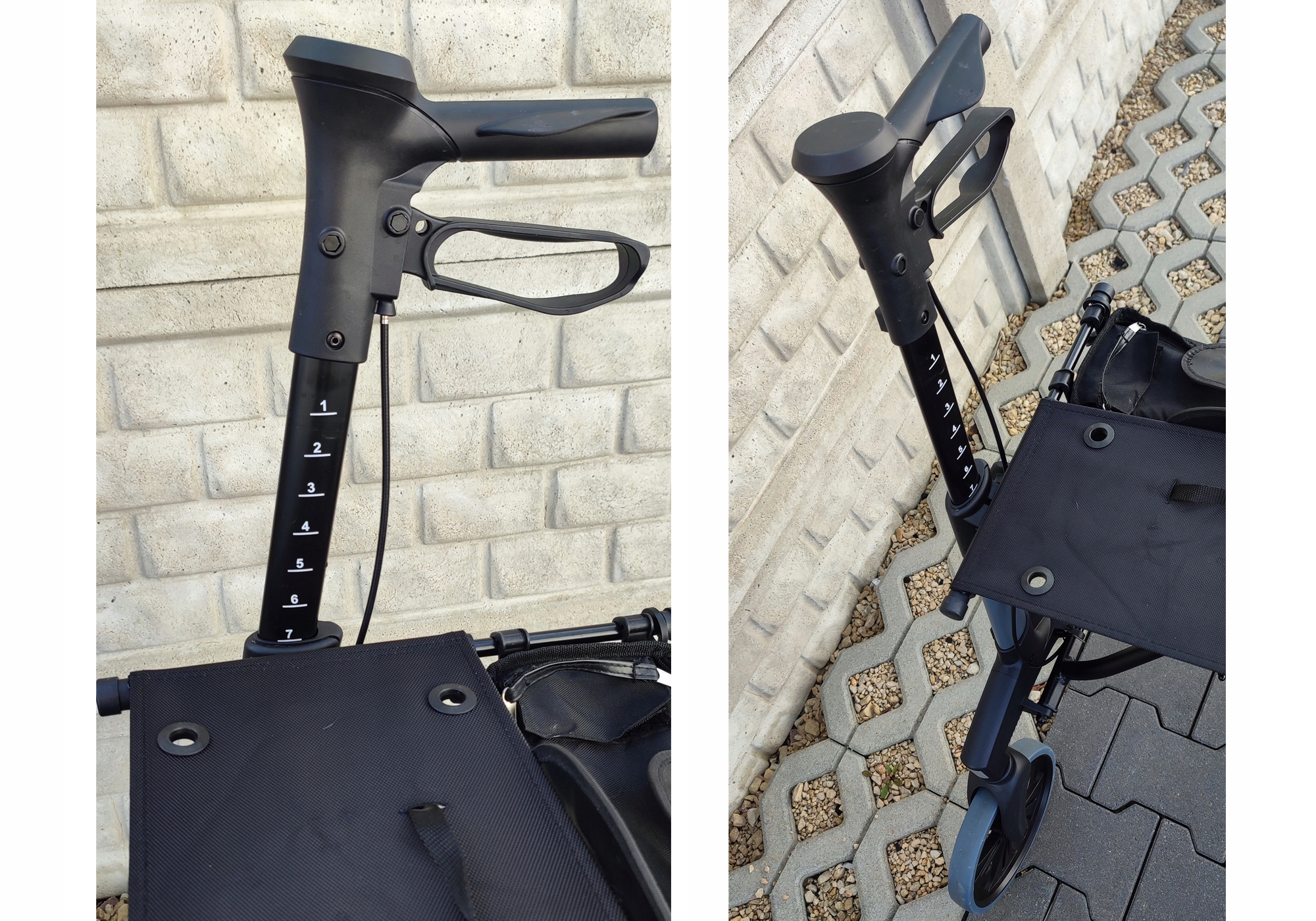 - Ручки, що регулюються по висоті, стоянкове гальмо, допомога вставати тримач для тростини