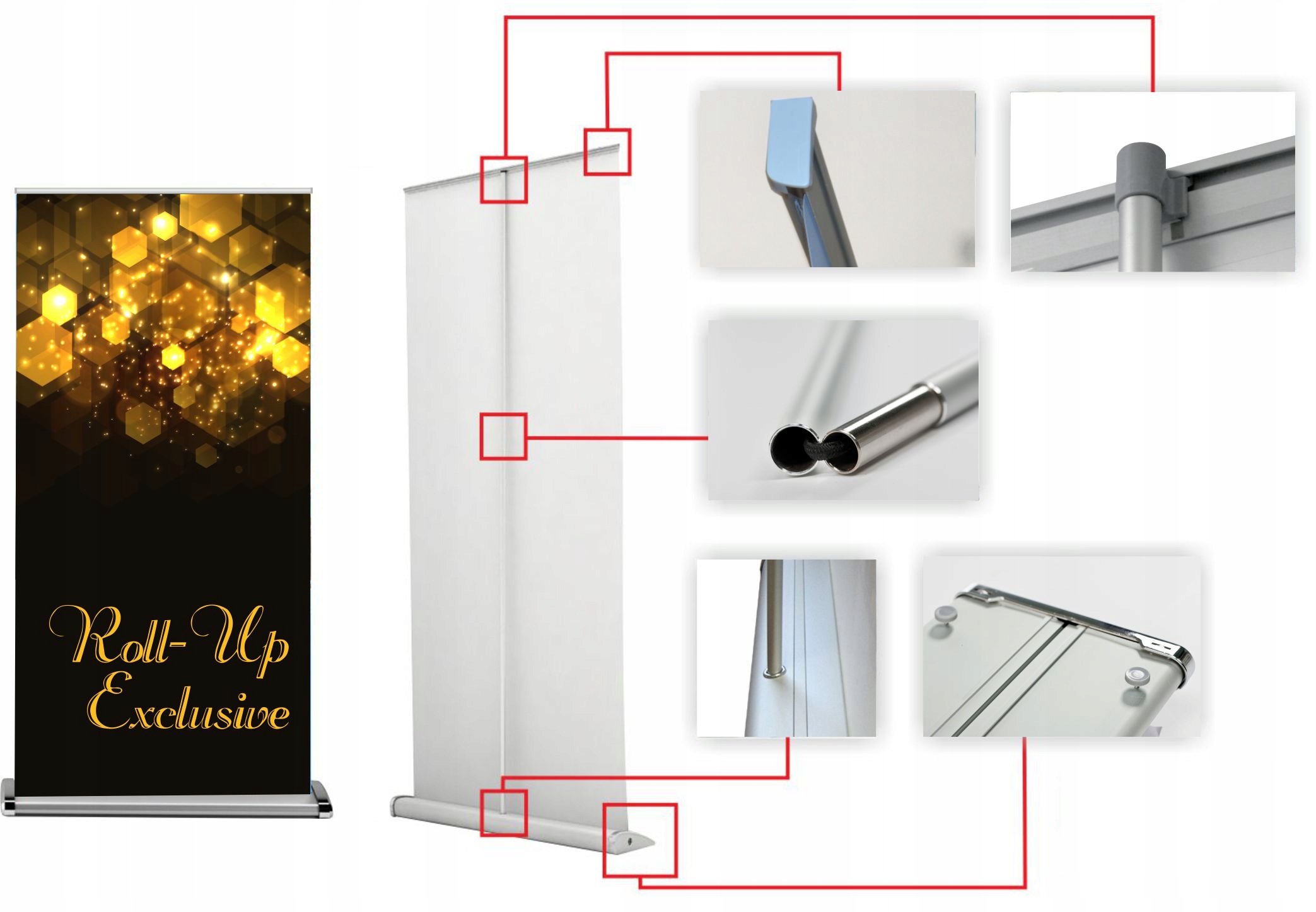 Рол-ап складається з алюмінієвої касети та рамки з прикріпленою графікою. Ексклюзивна версія має важку та елегантну касету без ніжок, товсту штангу та хромовані боки.