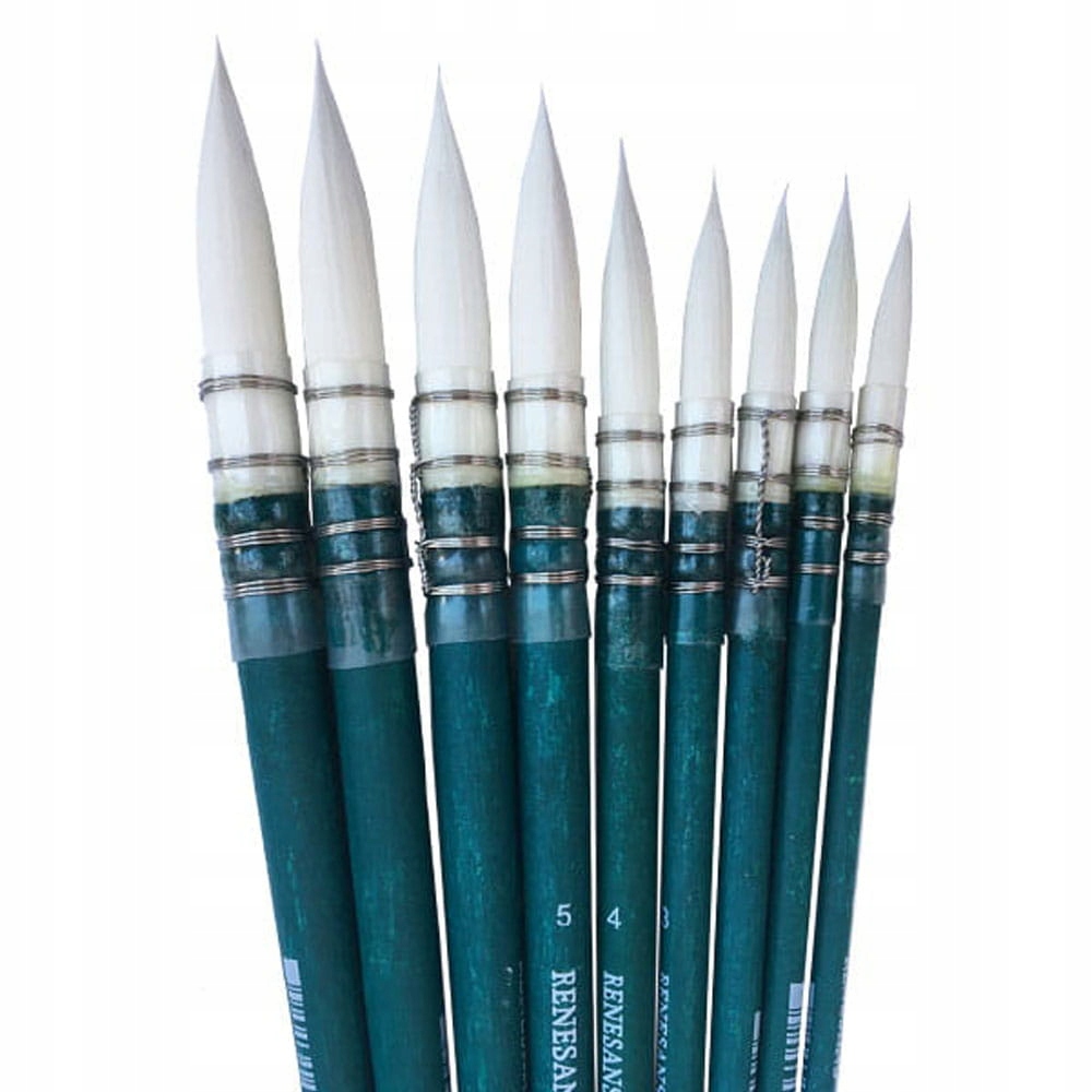 рулонна щітка має білу, круглу, нейлонову щетину швабри. Він м'який і еластичний, що робить його дуже добре підходить для акварельних фарб. Вони зберігають велику кількість фарби, що дозволяє малювати точні лінії. Ручки короткі, дерев’яні, пофарбовані в бірюзу.