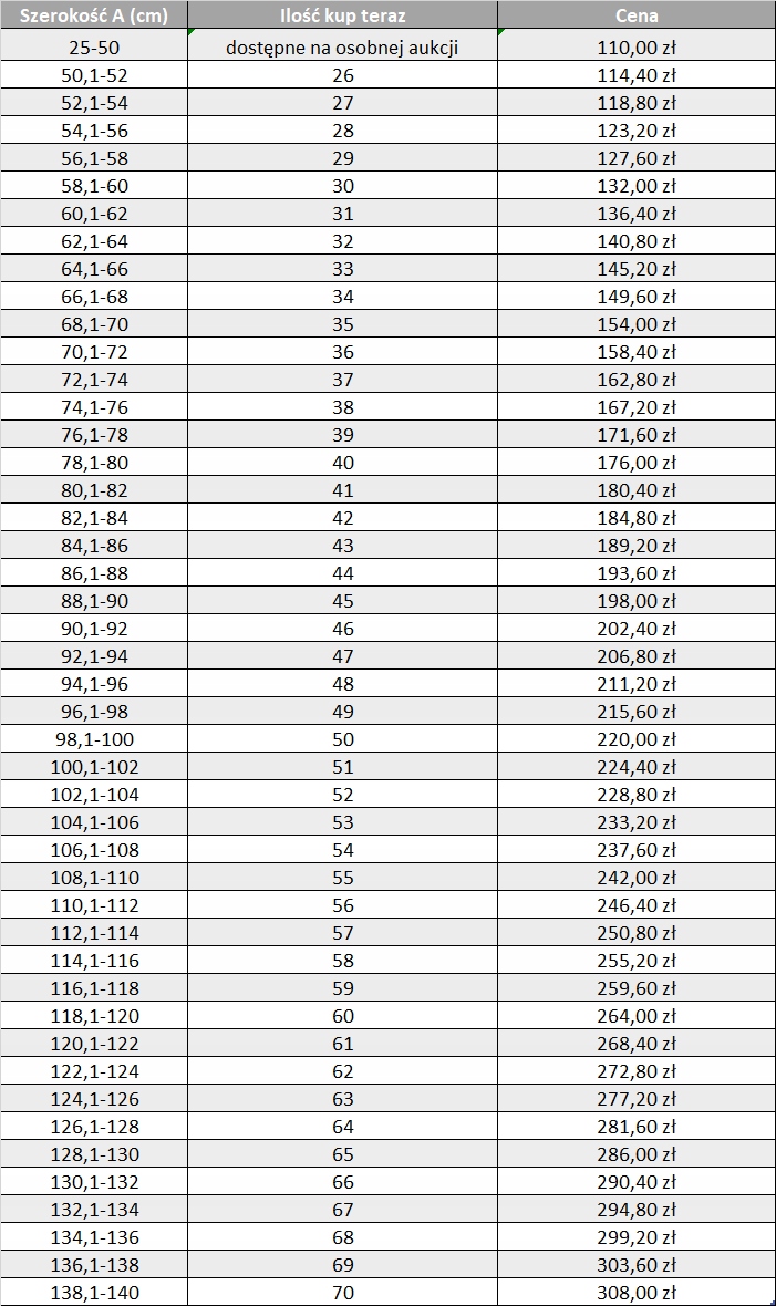 Напр. Рулонна штора A-розміру 60 см коштує 132 злотих (30*4,4 злотих)