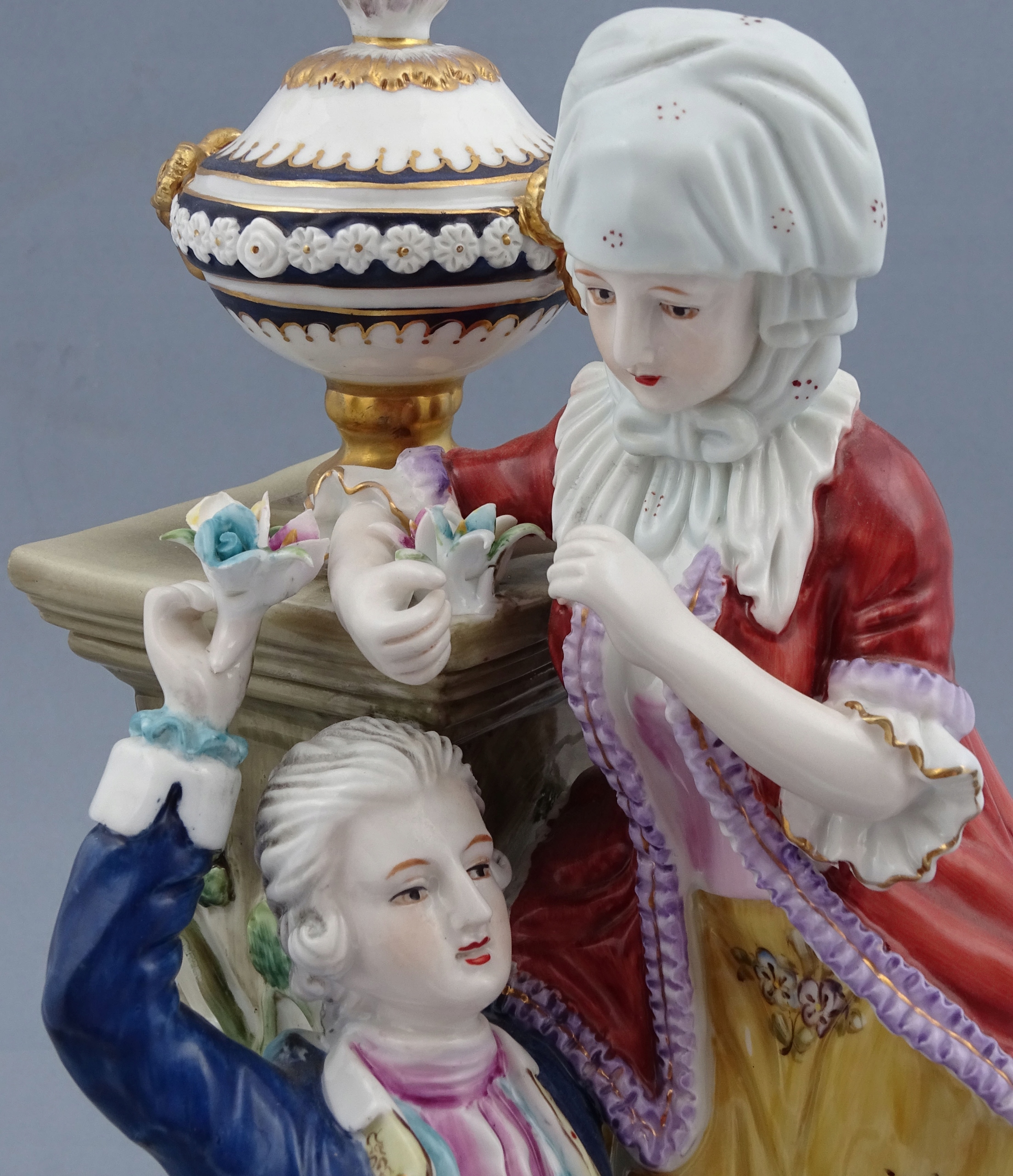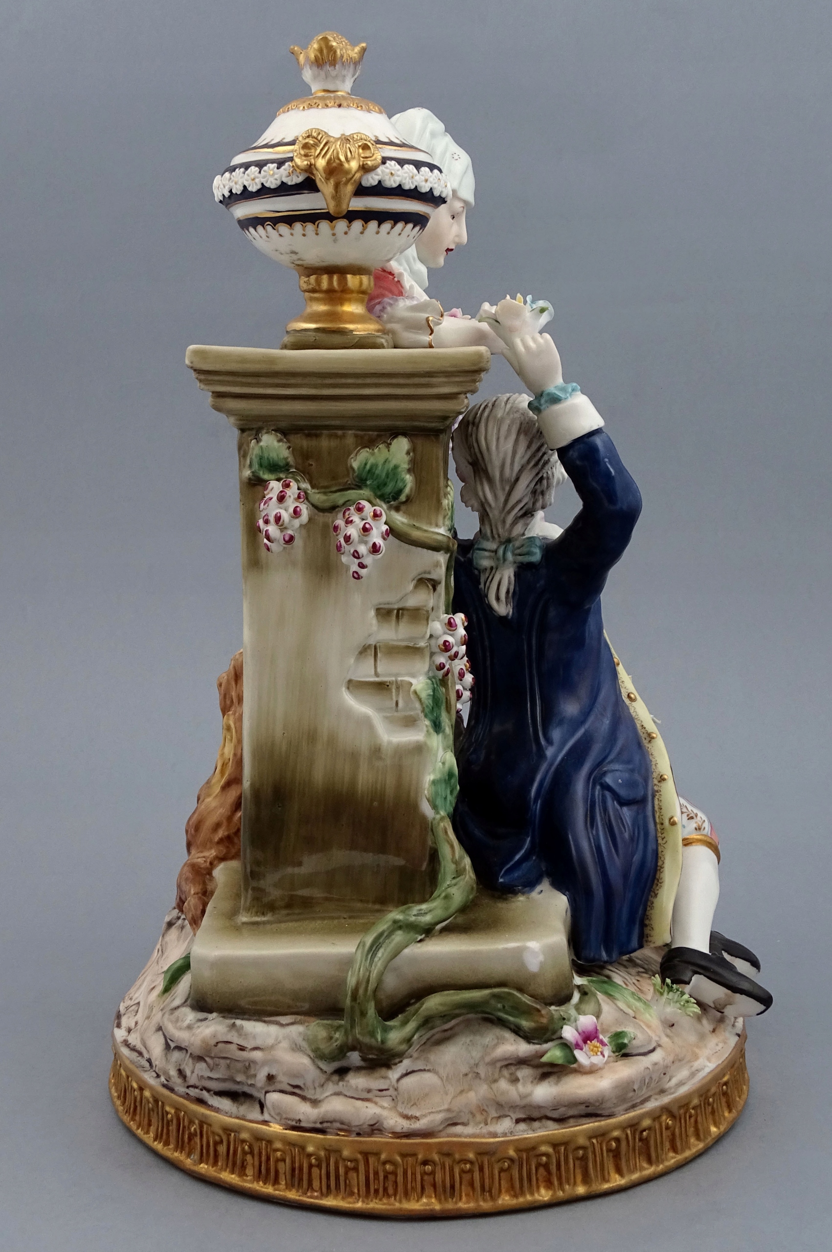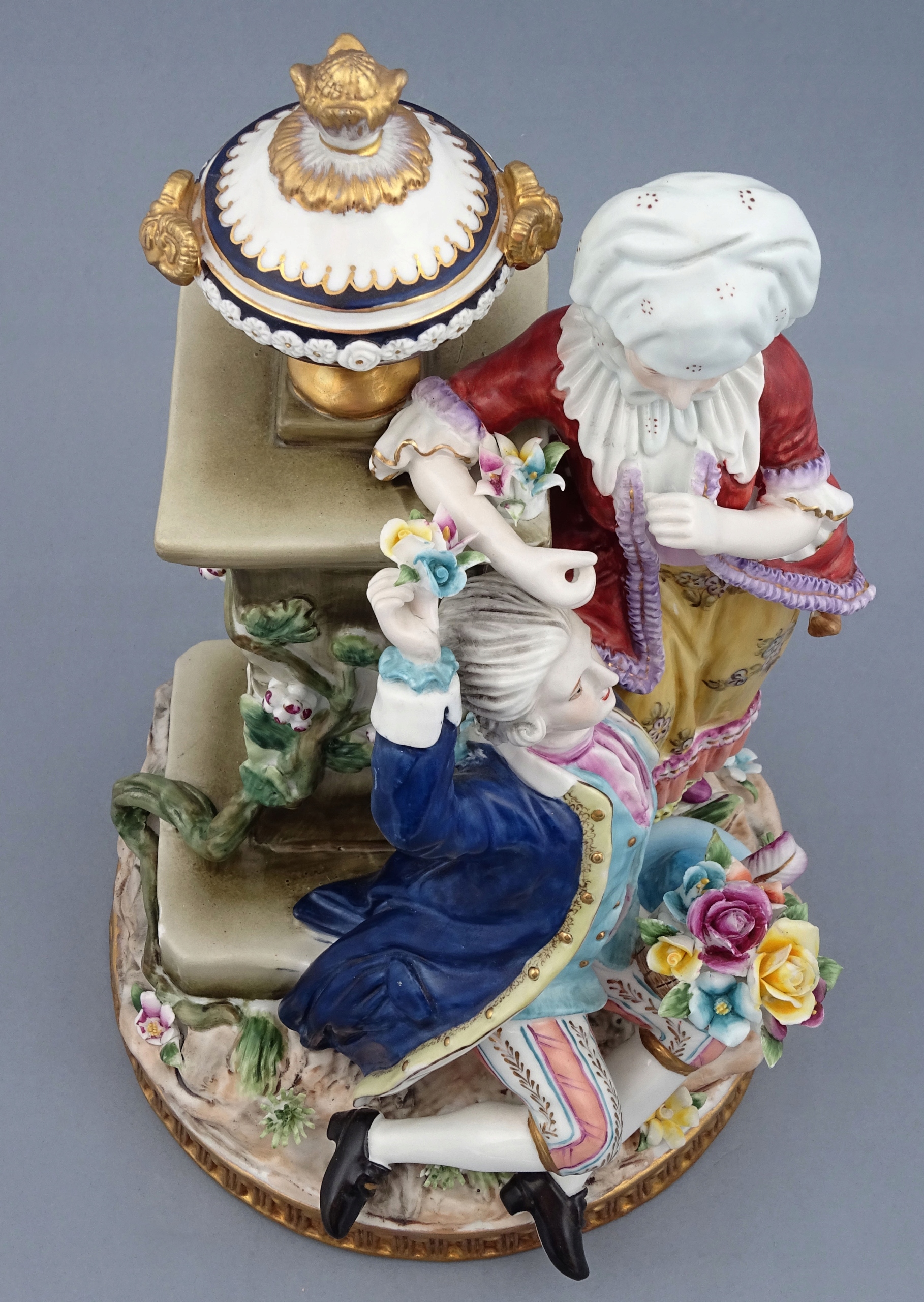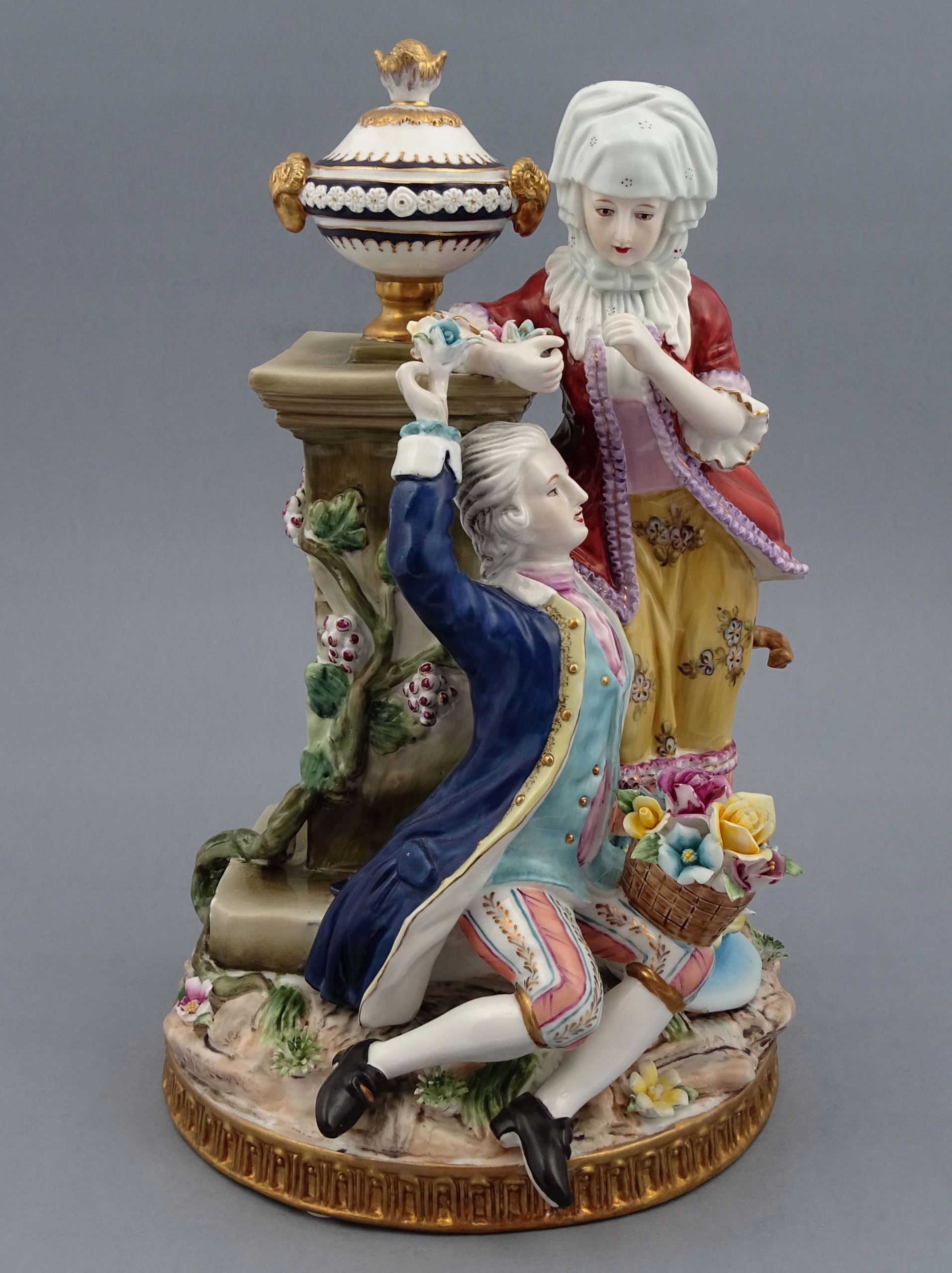 З круглою основою, прикрашеною золотими рокайльними мотивами, сидяча фігура елегантного чоловіка, одягненого у вишукане вбрання, з кошиком, наповненим різнокольоровими квітами на колінах, і поруч із так само шикарно одягненою молодою жінкою, яку чоловік обожнює. Позаду подружжя стоїть постамент, на якому висить кущ із квітами, а зверху тонка ваза. Все це прикрашено різнокольоровими гілочками рослин і квітами.