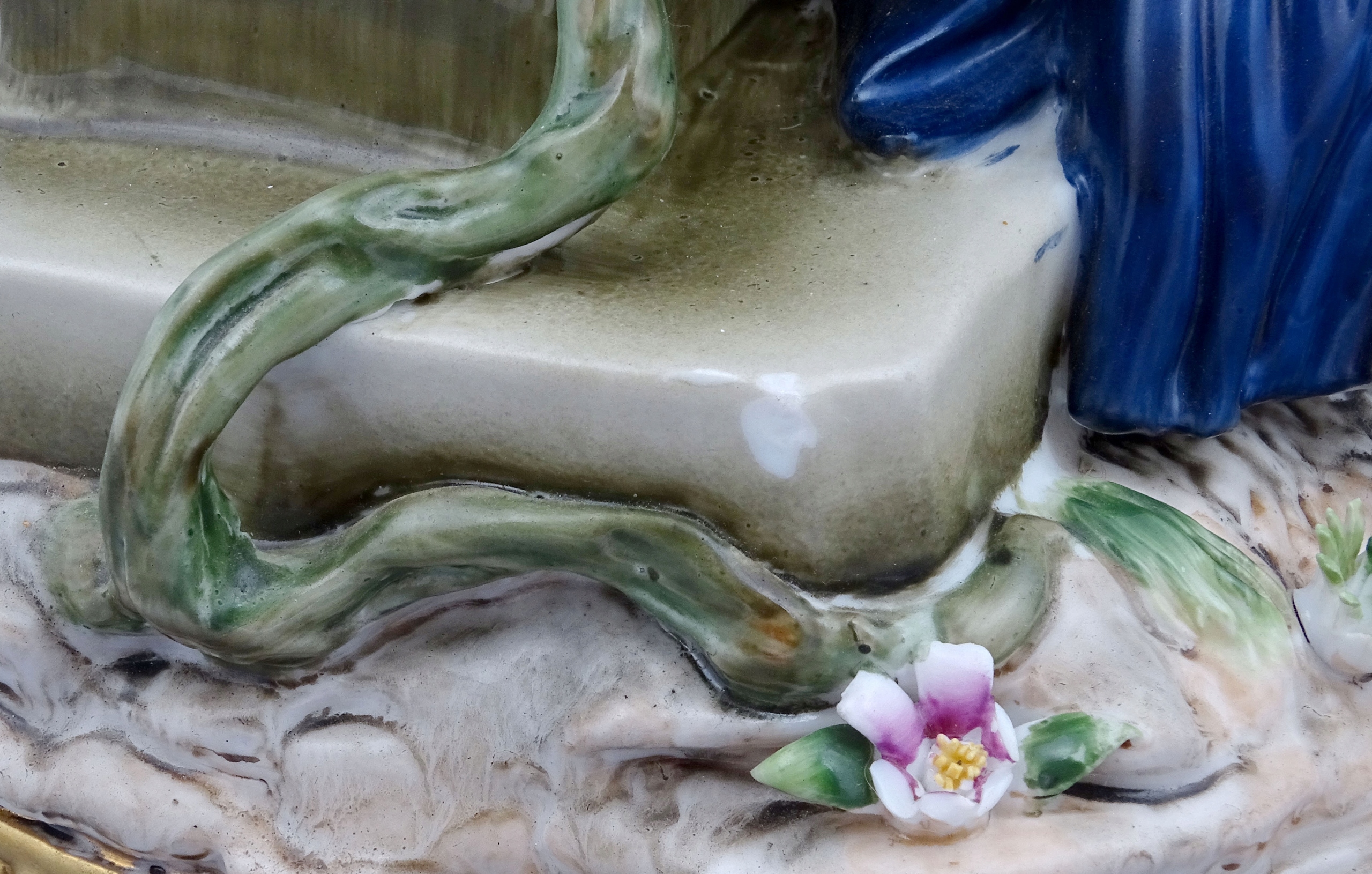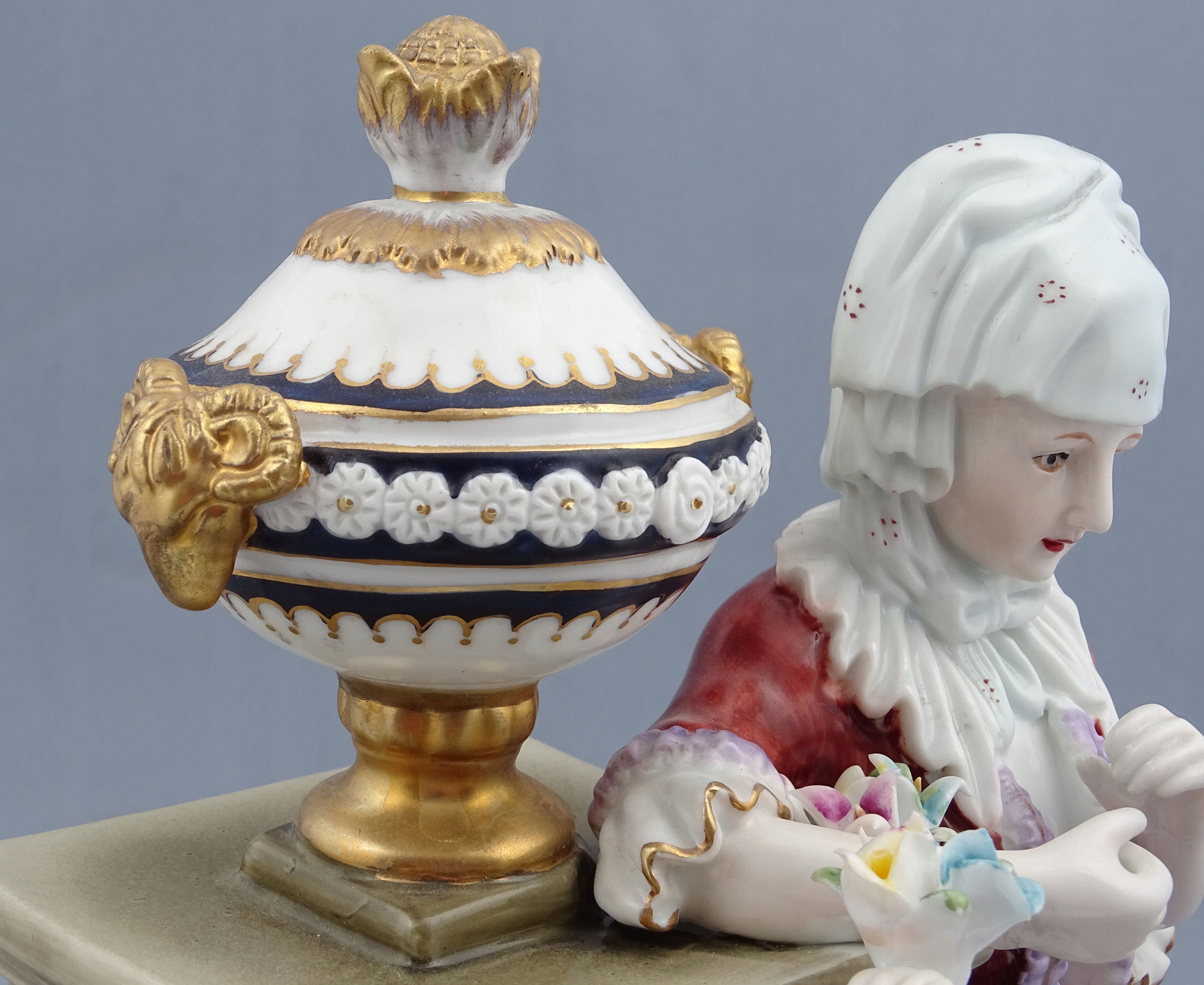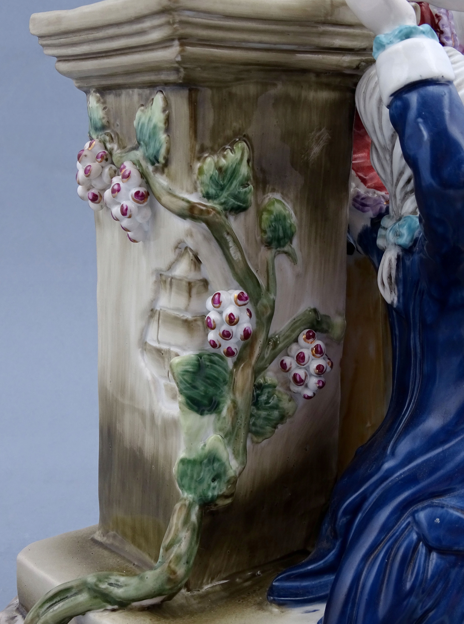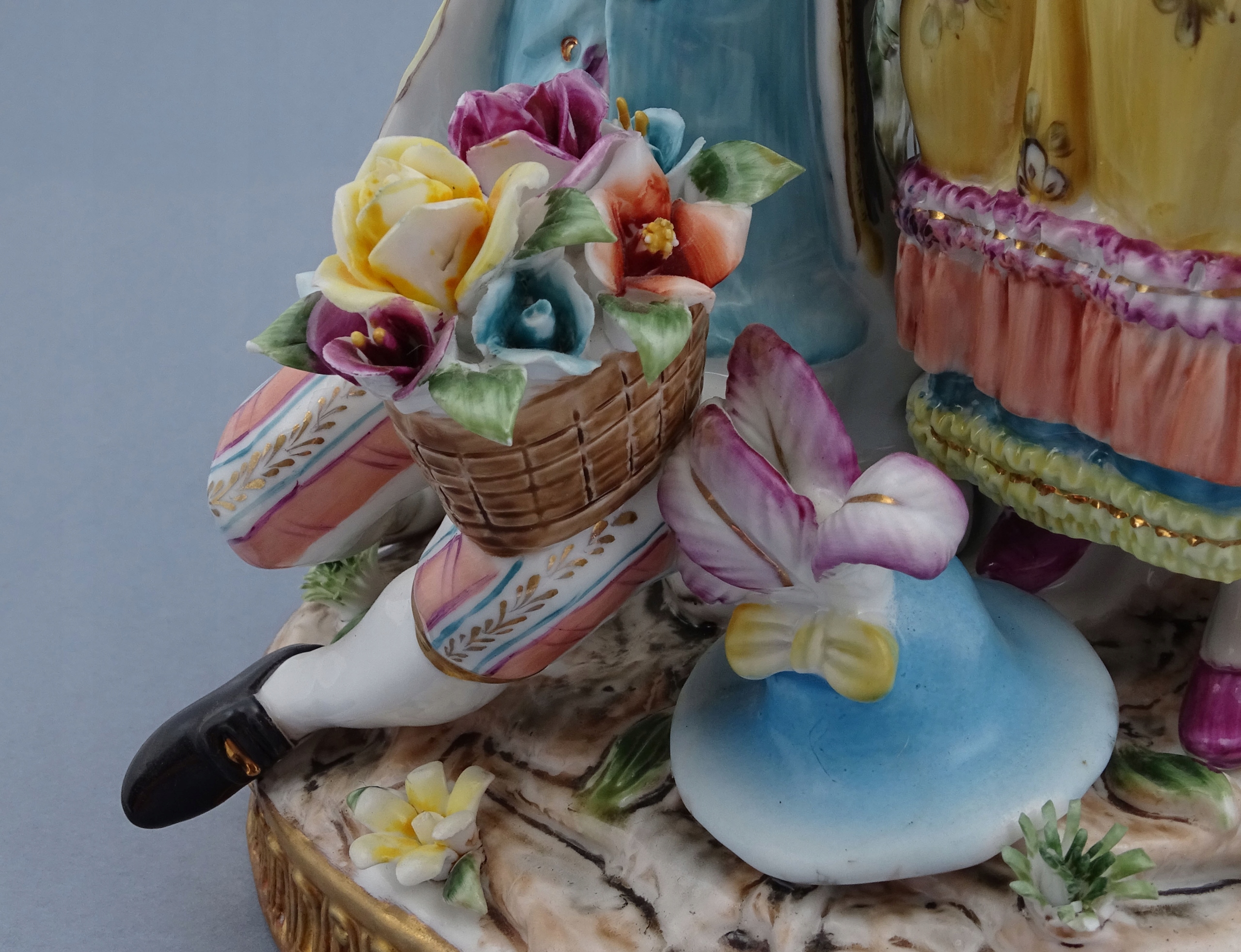 З круглою основою, прикрашеною золотими рокайльними мотивами, сидяча фігура елегантного чоловіка, одягненого у вишукане вбрання, з кошиком, наповненим різнокольоровими квітами на колінах, і поруч із так само шикарно одягненою молодою жінкою, яку чоловік обожнює. Позаду подружжя стоїть постамент, на якому висить кущ із квітами, а зверху тонка ваза. Все це прикрашено різнокольоровими гілочками рослин і квітами.