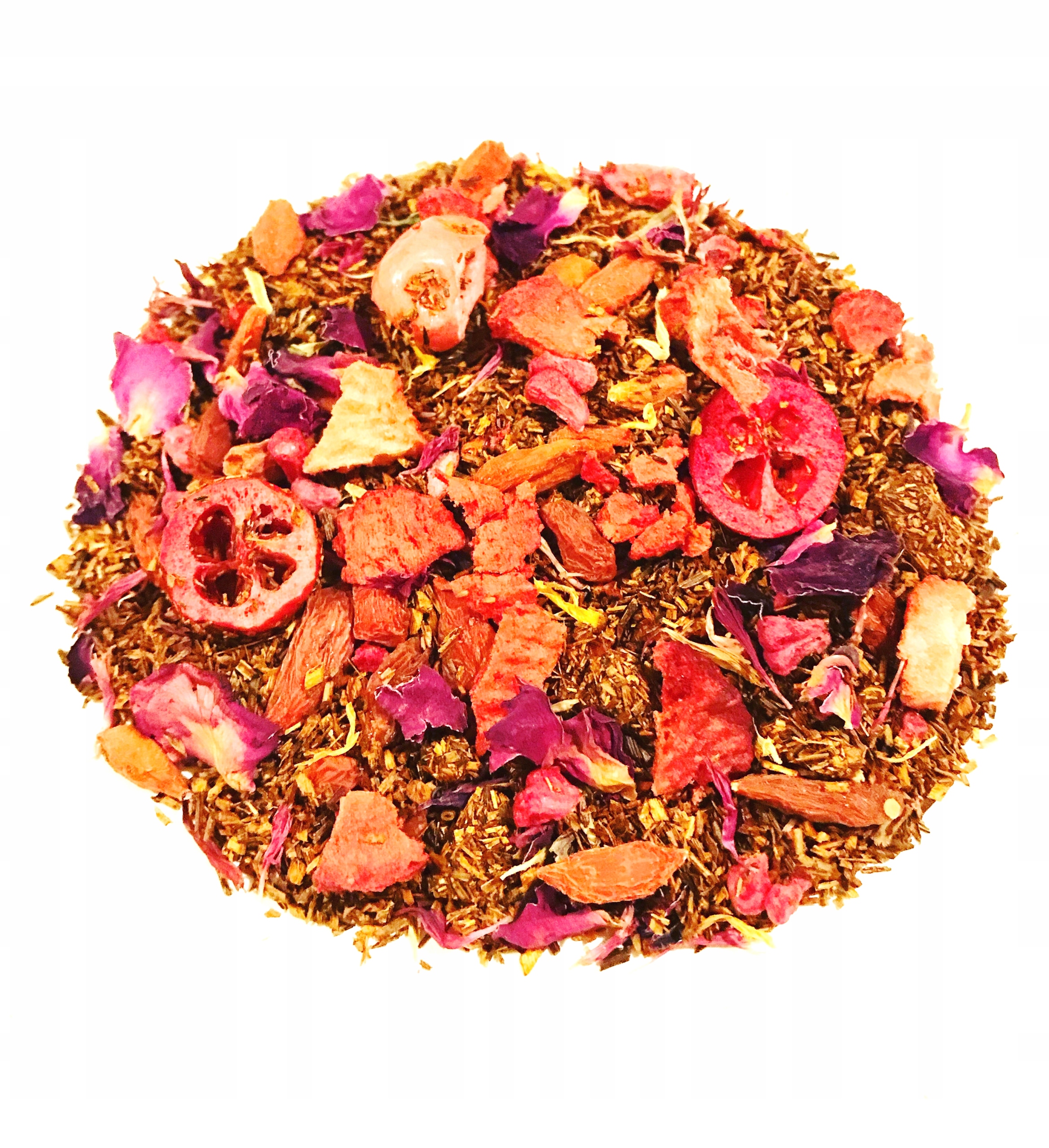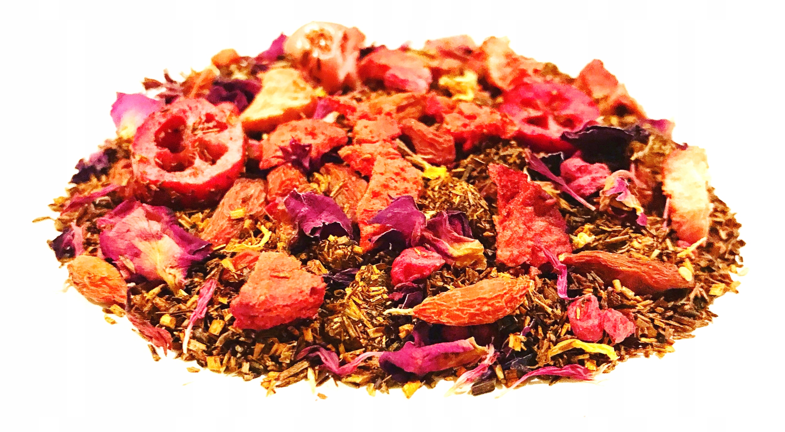 Інгредієнти: Ройбуш, ягоди годжі, полуниця, малина та журавлина, пелюстки троянд, волошка рожева, півонія, сушені квіти гібіскуса.