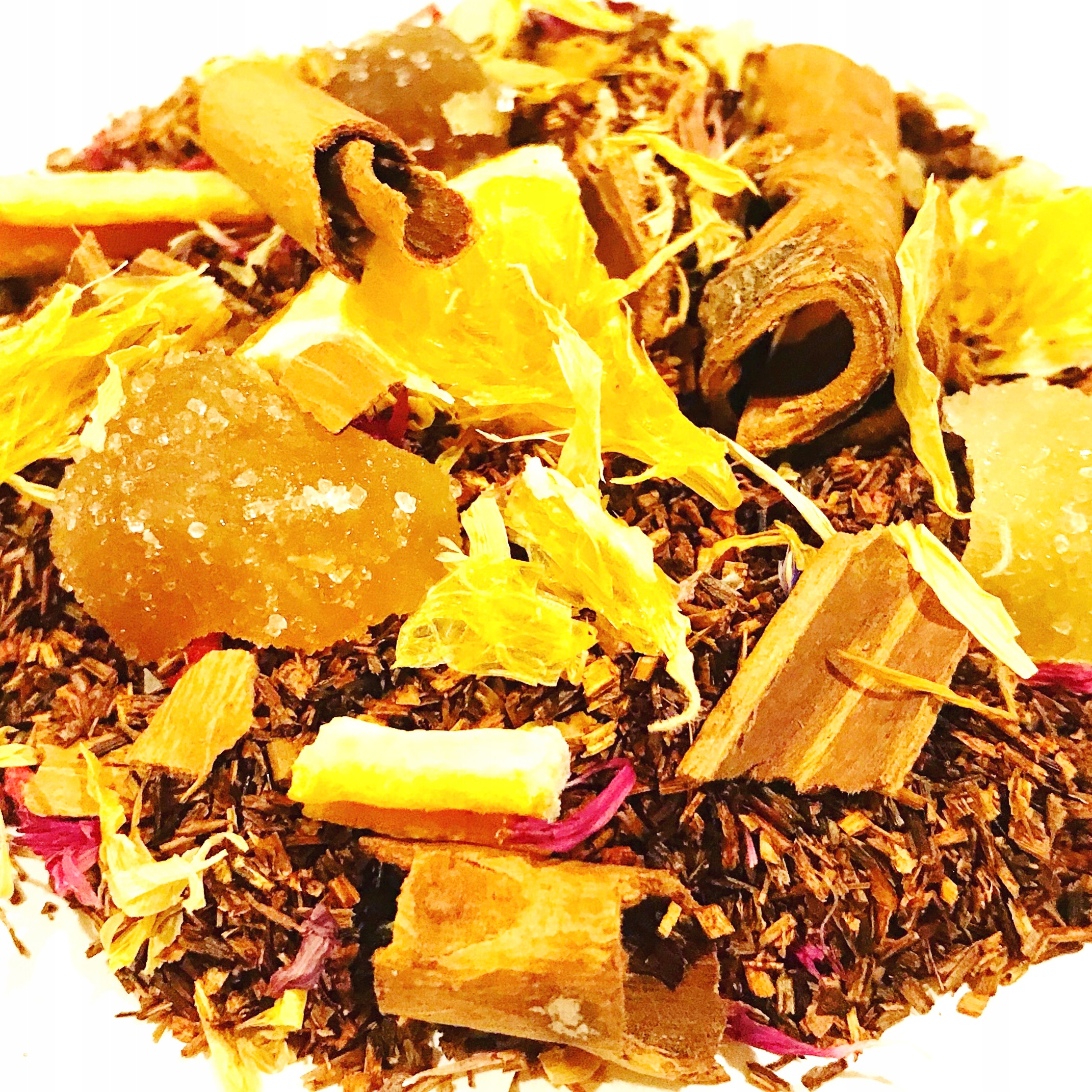 Склад: ройбуш, кора кориці, цукати імбиру, цукати апельсина, календули, пелюстки троянди та гібіскуса.