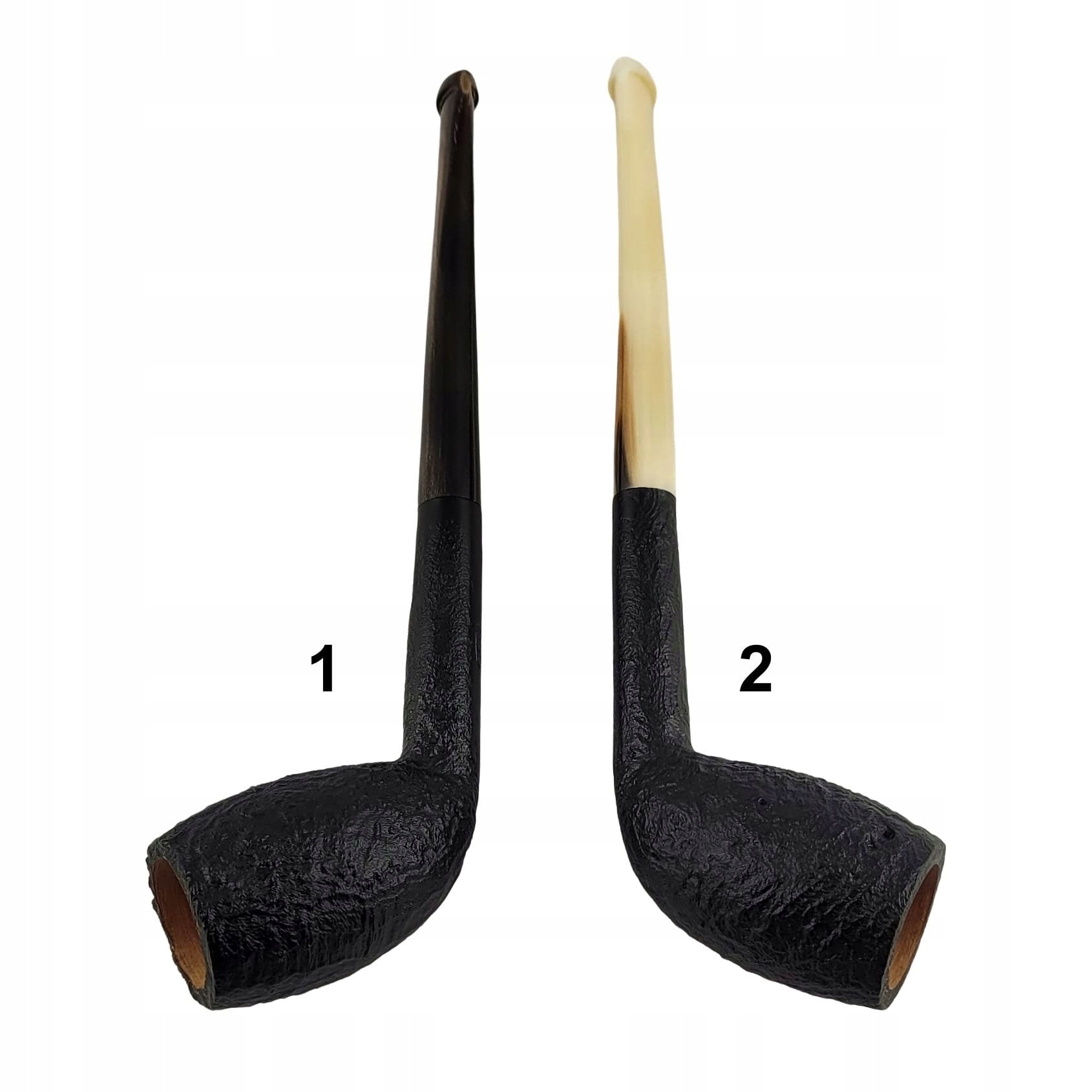 Важливо! Мундштуки виготовлені з натурального рогу буйвола, який природно має світлі та темніші ділянки. Люльки поділяються на моделі з темнішим (1) і світлішим (2) мундштуком. Приклад колірної гами видно на описаному фото.