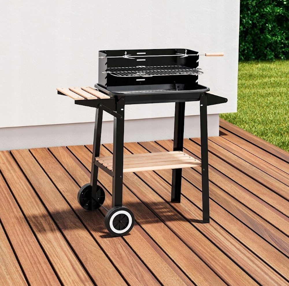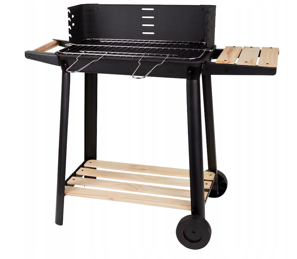 Модель прямокутного гриля з дерев’яними лотками, випічкою та зберіганням. Побудовані колеса дозволяють легко та зручно переносити.