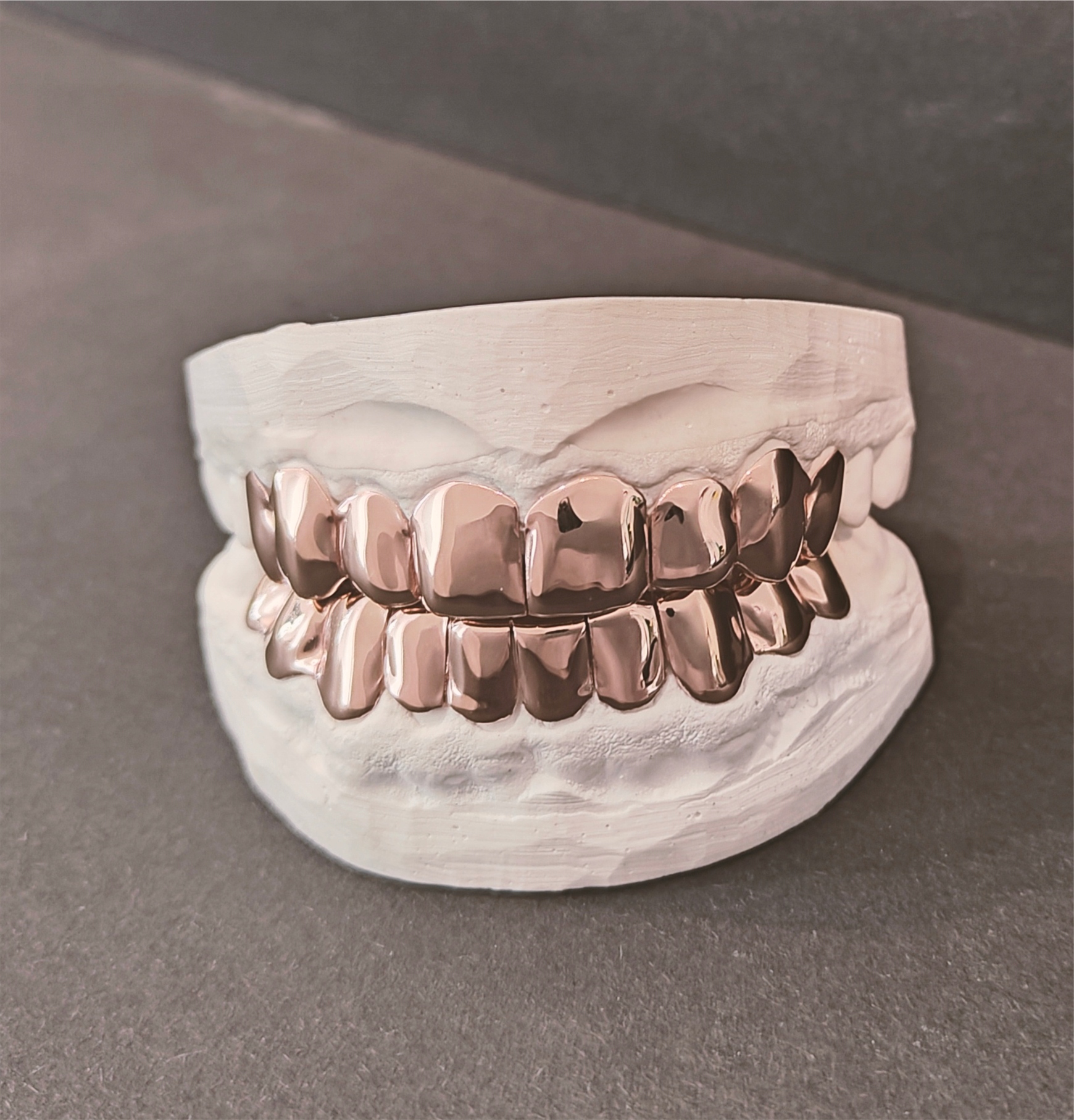 Нечутлива зупинка, Срібне ядро дослідження 925, біосумісні лігури, гальвенізація рожевого золота 14 каркад/ 4 шини, фініш 3000 (градація) глос, відокремлені зуби, ручні, без використання 3D-технології. Забезпечений набір вражень надсилається вам, готовий до використання. Завдяки цьому ми ідеально відповідаємо вашим грилям.