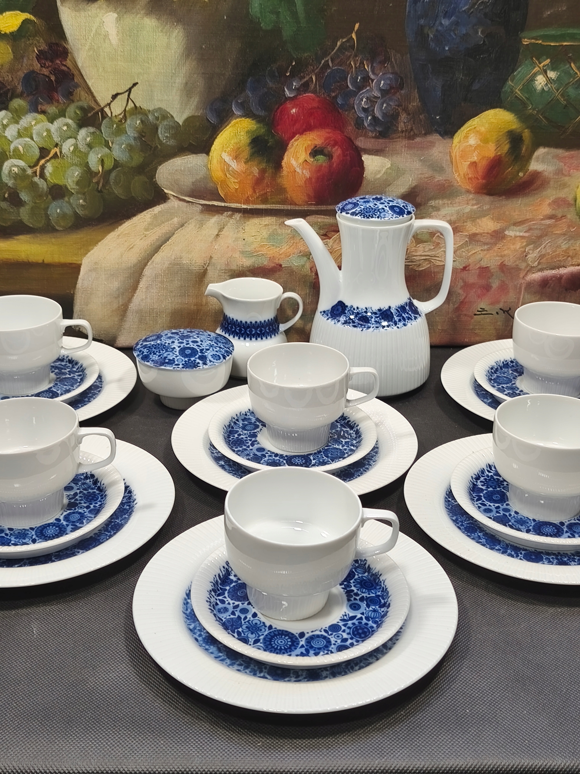 Дуже декоративна служба кави для 6 осіб з етикетки Rosenthal Porcelain. Порцелянова біка з кобальтовим художнім малюнком, ривні рельєфи країв, декоративні кришки. Дуже хороший стан без недоліків. Кавовий стрижень з кришкою висотою 17,5 см, цукрова миска з кришкою, молоко в іншому прикрасі в одному кольорі, 6 плівок з висотою 6,5 см і наповнювачем діаметром 7,5 см, 6 13 см стоїть і 6 десертів з діаметром 19,5 см. Рекомендую.