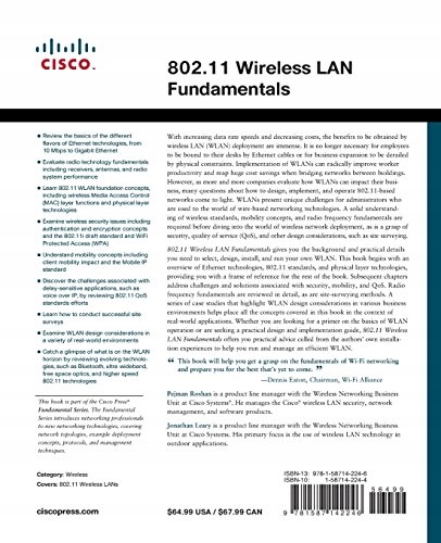 Опануйте основи проектування, створення та керування Cisco Aironet WLAN. Оволодійте основами бездротових локальних мереж за допомогою цього короткого посібника з проектування та розгортання. Зрозумійте проблеми впровадження для різноманітних середовищ, включаючи вертикальні мережі, мережі SOHO та корпоративні мережі. Дізнайтеся поради щодо проектування та усунення несправностей із прикладів реального світу 802.11 Wireless LAN Fundamentals дає мережевим інженерам та ІТ-фахівцям знання, необхідні для проектування, розгортання, керування та усунення несправностей власних бездротових локальних мереж (WLAN). Починаючи з огляду технології та архітектури WLAN, книга продовжує пояснювати послуги та розширені функції, які можуть надавати такі програми. Найважливіше те, що він надає практичні вказівки щодо проектування та рекомендації щодо розгортання. Бездротові локальні мережі з’єднують комп’ютерні мережі за допомогою радіопередач замість традиційних телефонних ліній або кабелів. Переваги цих систем виходять далеко за межі позбавлення від усіх кабелів і проводів. Кампусні мережі можуть географічно розширюватися, зберігаючи всю свою ефективність і швидкість. Крім того, можна заощадити кошти, коли більше не потрібні сторонні телефонні лінії, заощаджуючи витрати на оренду лінії та технічне обслуговування обладнання. Нарешті, гнучкість у проектуванні мережі кампусу значно збільшується для мережевих професіоналів, тоді як доступність мережі та корисність зростає для окремих користувачів. 802.11 Wireless LAN Fundamentals допомагає мережевим професіоналам реалізувати ці переваги, допомагаючи їм зрозуміти, як проектувати, будувати та підтримувати ці мережі, а також як виправдати їх цінність в організаціях.