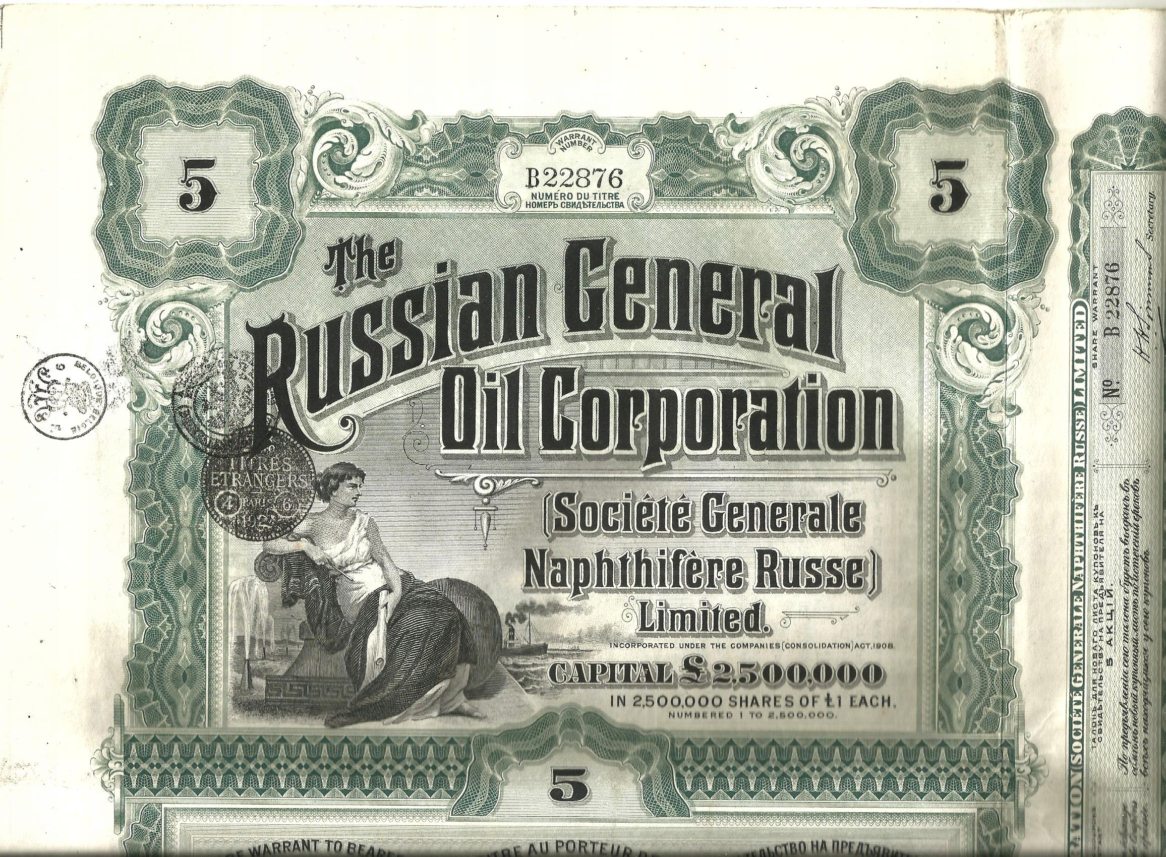 Опис: ITEM IS ВИДАНО В ЛОНДОНІ, У ШТАБ-КВАРТИРІ КОМПАНІЇ, ЩО ЕКСПЛУАТУЄ НАФТОВУ ШАХТУ БІЛЯ БАКУ, У СЬОГОДНІШНЬОМУ АЗЕРБАЙДЖАНІ. ІСТОРІЯ КОМПАНІЇ ПОЧИНАЄТЬСЯ З 1876 РОКУ, КОЛИ РОБЕРТ НОБЕЛЬ, БРАТ АЛЬФРЕДА, КУПИВ НАФТОВЕ РІДОВНИЩЕ В БАКУ. ЗА КІЛЬКА РОКІВ ВІН СТВОРИВ ПОТУЖНУ КОМПАНІЮ BRANOBEL, У ЯКІЙ ТАКОЖ БУВ АКЦІОНЕРОМ АЛЬФРЕД І ТРЕТІЙ БРАТ ЛЮДВІК. ПІСЛЯ СМЕРТІ ЗАСНОВНИКІВ, У 1912 РОЦІ, КОМПАНІЯ БУЛА ПЕРЕТВОРЕНА В ХОЛДИНГ З 20 НАФТОВО-БАНКІВСЬКИХ ПІДПРИЄМСТВ РОСІЙСЬКА ГЕНЕРАЛЬНА НАФТОВА КОРПОРАЦІЯ. У 1920 РОЦІ ПІСЛЯ ВХОДУ БІЛЬШОВИКІВ ДО БАКУ БУЛИ НАЦІОНАЛІЗОВАНІ ВСІ НАФТОВІ РОДОВНИЩА. ГАРНІ ДЕКОРАТИВНІ МОТИВИ З ОБМАНОМ З ГЕОМЕТРИЧНИМИ ВІЗЕРУНКАМИ ТА ВІНЬЄТКОЮ З АЛЕГОРИЧНИМ ФІГУРОМ НА ТЛІ НАФТОВИХ РОДОВНИЩІВ ТА КАСПІЙСЬКОГО МОРЯ. НА АКЦІЯХ ЧЕРВОНА МАРКА СКАРБУ ЗА 1 ШИЛІНГ. РІДКІСНА ЦІННІСТЬ НА ПОЛЬСЬКОМУ АНТИКВАРНОМУ РИНКУ. РІДКІСТЬ ДЛЯ КОЖНОГО КОЛЕКЦІОНЕРА ТА ЛЮБИТЕЛЯ ЦІННОСТЕЙ НАФТОВОЇ ПРОМИСЛОВОСТІ.
