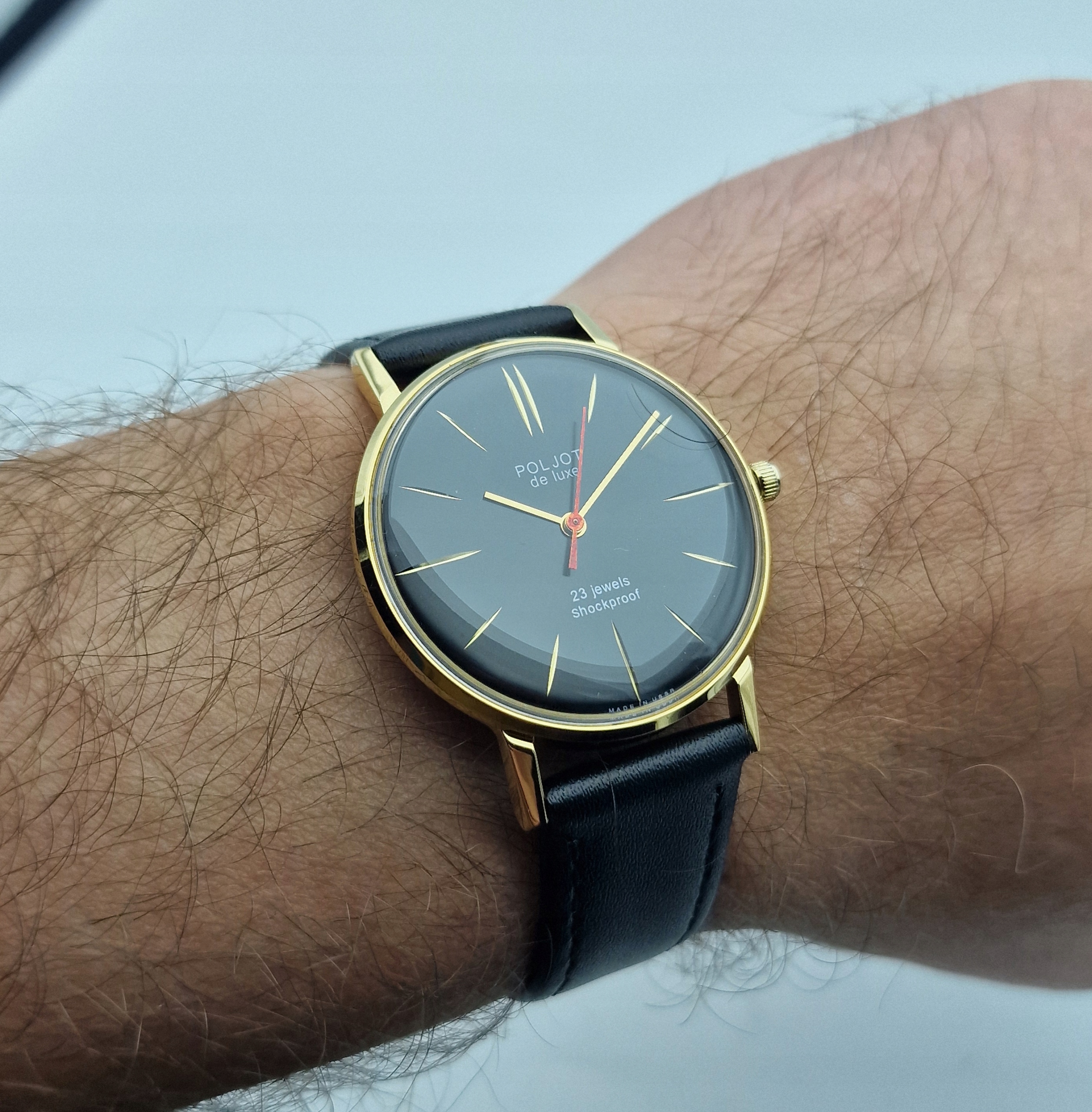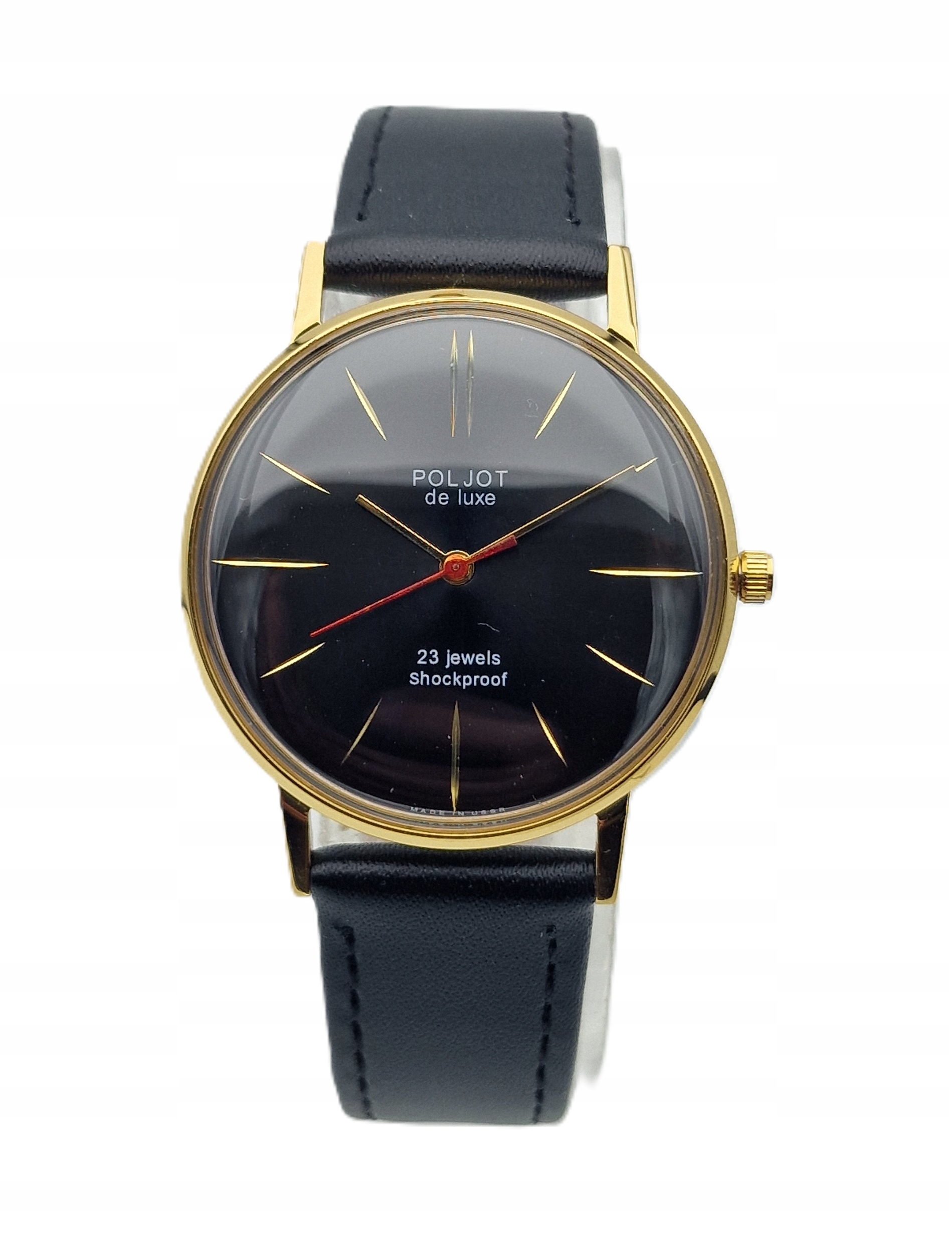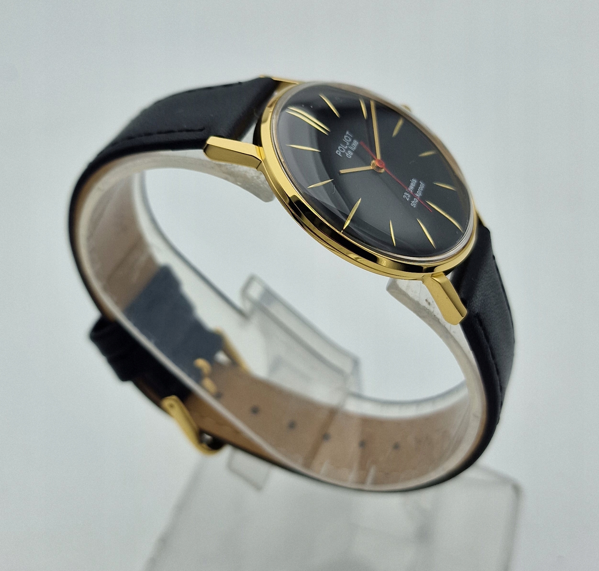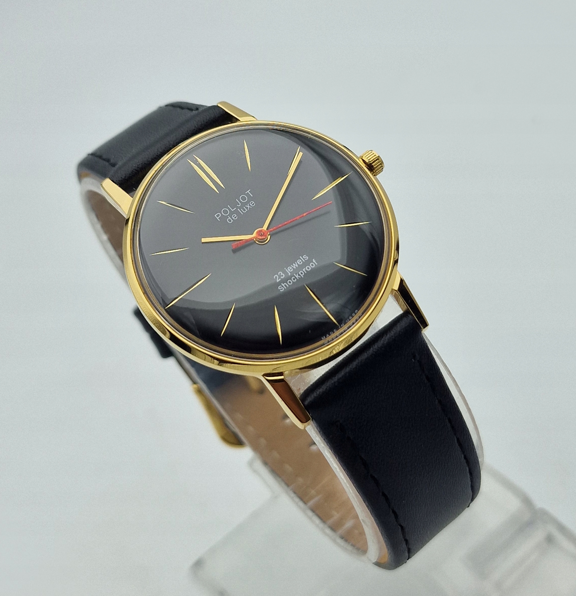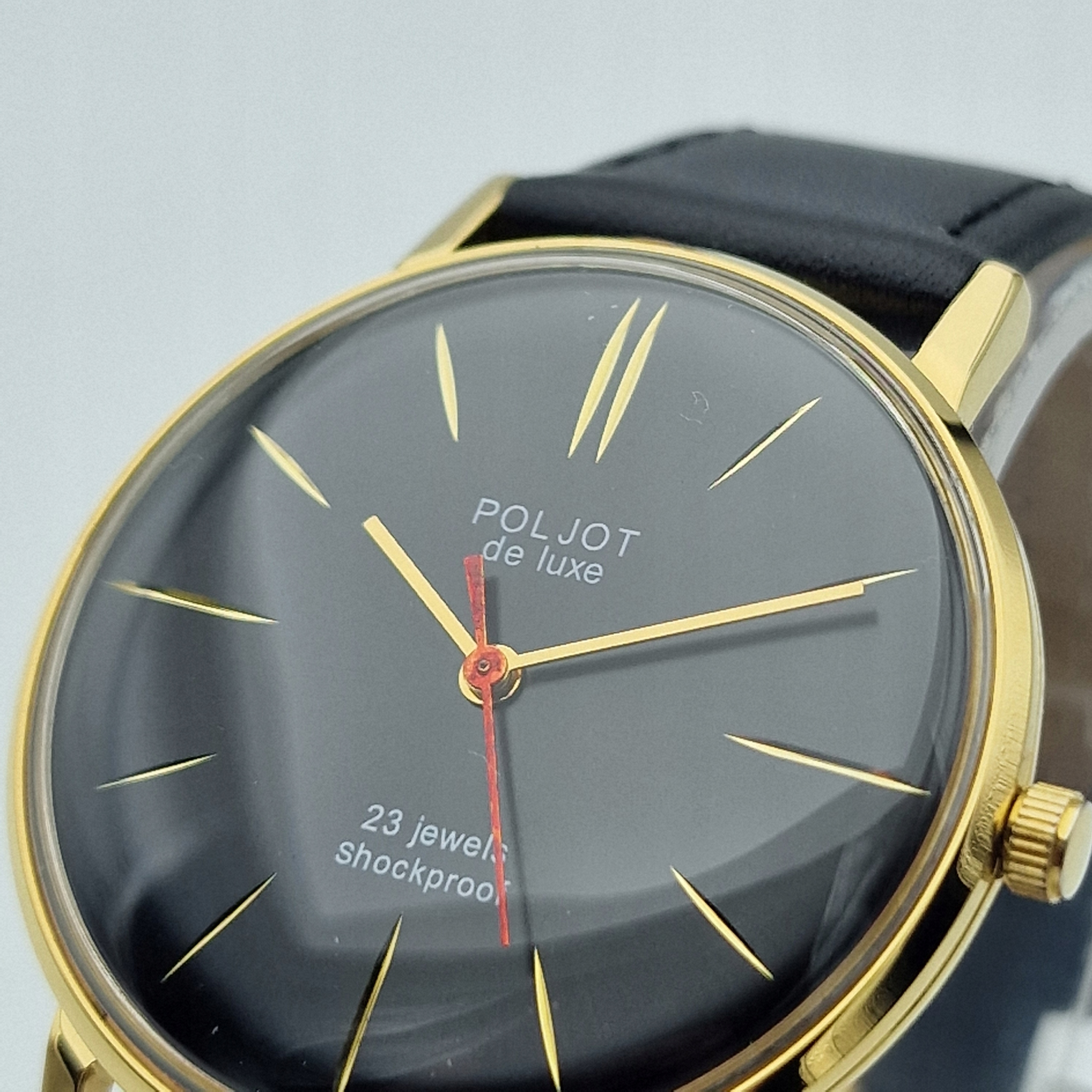 - Чорний металевий циферблат із золотими годинниковими мітками. Циферблат підписаний: «POLJOT DE LUXE, 23 КОШТОЦІННОСТІ, ПРОТИВУДАРНИЙ, ЗРОБЛЕНО В СРСР». Циферблат в ідеальному стані.
