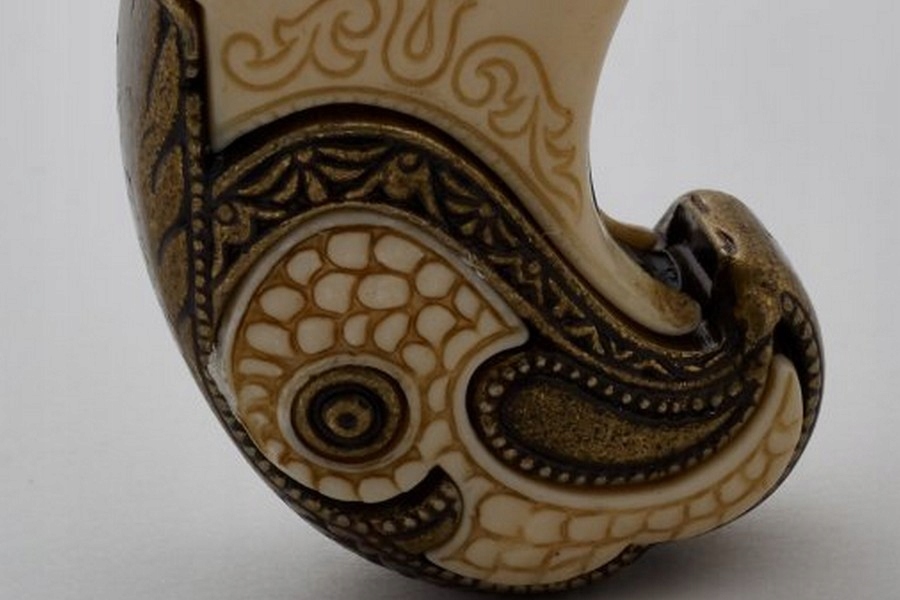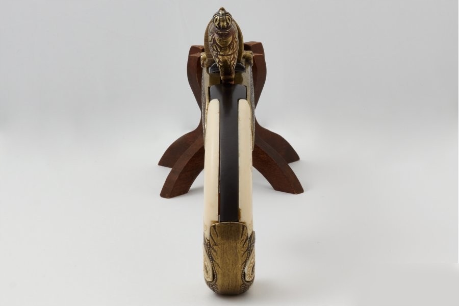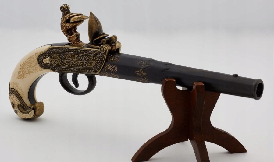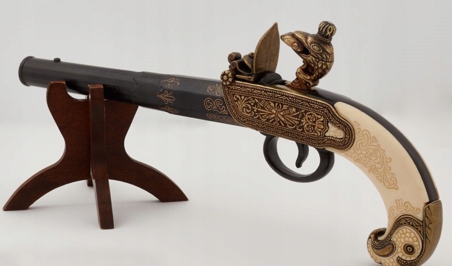 Невеликий за розміром, гарно оформлений, майже цілком металева зброя, з прикладом зі слонової кістки, увінчаним головою орла. Чудова продукція відомої та шанованої іспанської компанії Denix. Репліка вірно відображає унікальність цієї зброї. Восьмикутна, металева, декорована бочка. Приклад має однакове гарне гравіювання, оздоблений імітацією слонової кістки та декоративною головою орла. Замок розташований не з правого боку парчі, а в центрі, також багато прикрашений. Репліка абсолютно безпечна - дозволяє вести сухий постріл, заряджати зброю не можна. Механізм копії не воскрешає іскру! Все це виглядає дуже ефектно. Кількість і якість обробки деталей цієї зброї підкреслює її унікальність. Незважаючи на велику вагу, зброя збалансована і добре лежить в руці. З точки зору сьогодення ця зброя здається малоефективною, але своєю конструкцією, оздобленням та кольорами все одно радує око та... уяву. Розміщений на видному місці, він викличе інтерес у наших гостей.