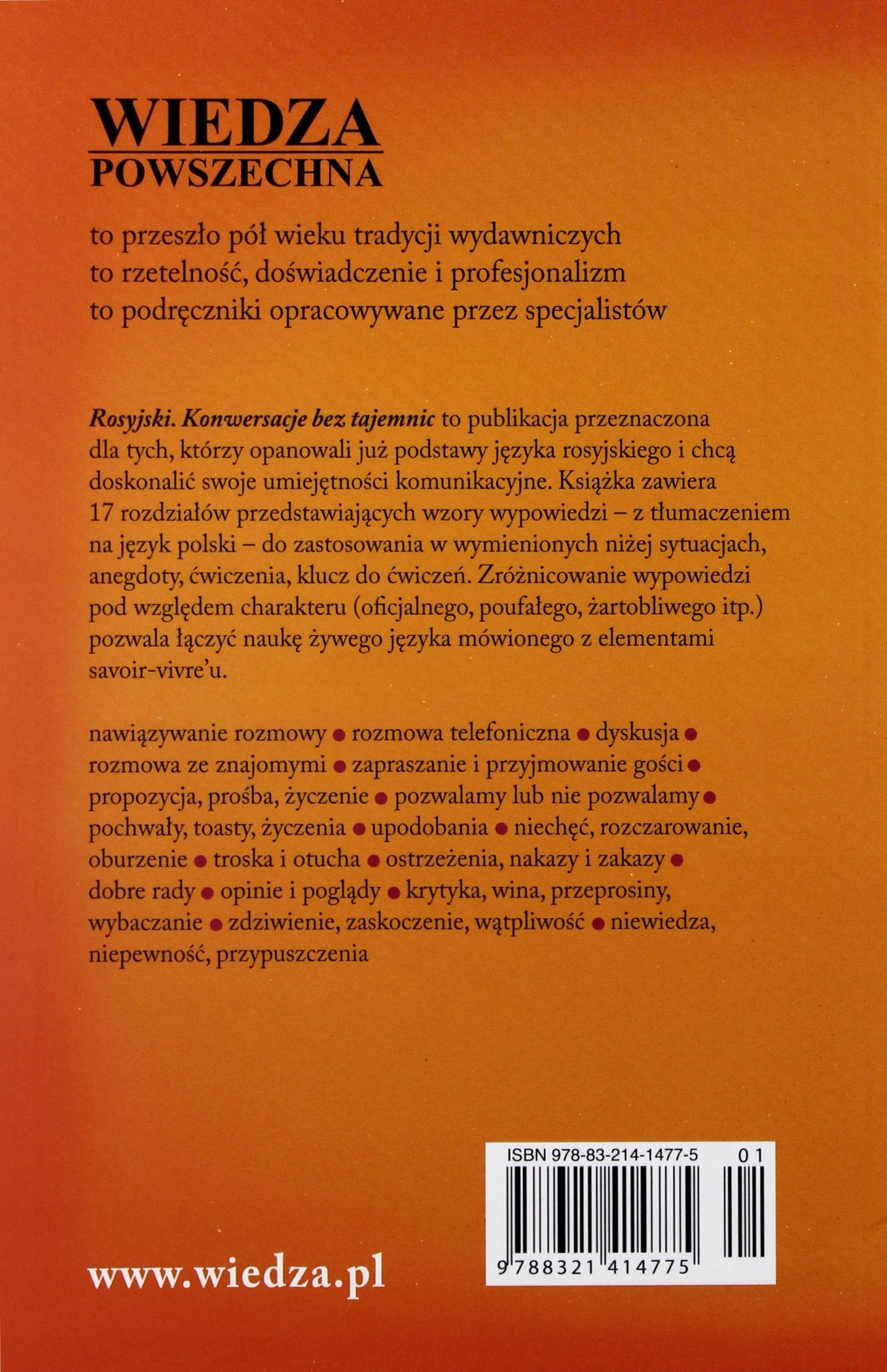 Російська. Бесіди без таємниць - це видання для тих, хто вже опанував ази російської мови і бажає вдосконалити свої навички спілкування. Книга містить 17 розділів, у яких представлено зразки мовлення – з перекладом на польську мову – для використання в наведених нижче ситуаціях, анекдоти, вправи та ключ до вправ. Урізноманітнення висловлювань за характером (офіційні, фамільярні, жартівливі тощо) дозволяє поєднати засвоєння живої розмовної мови з елементами savoir-vivre.