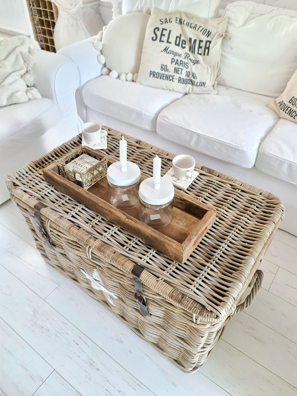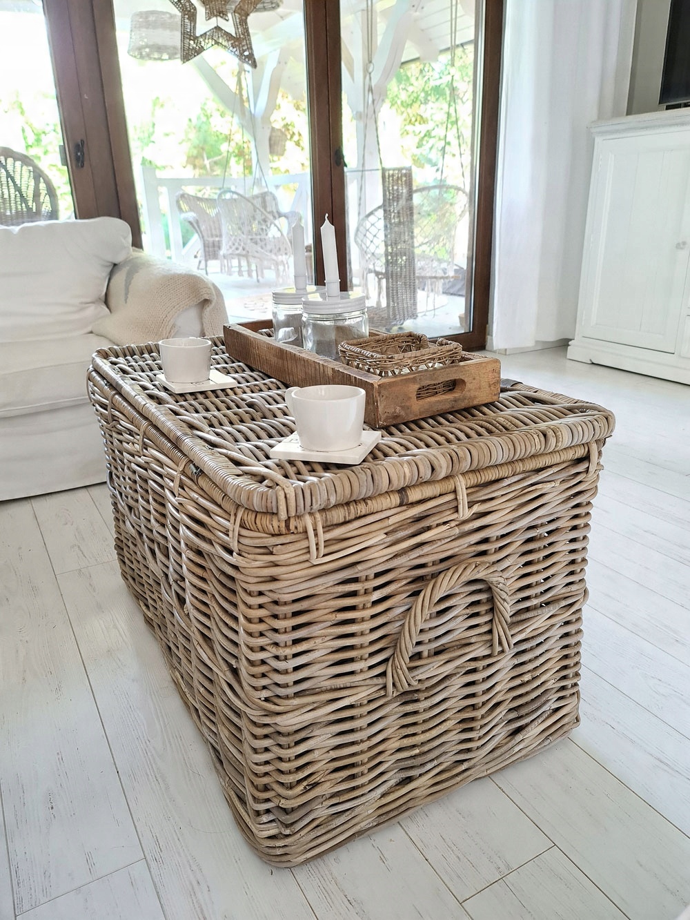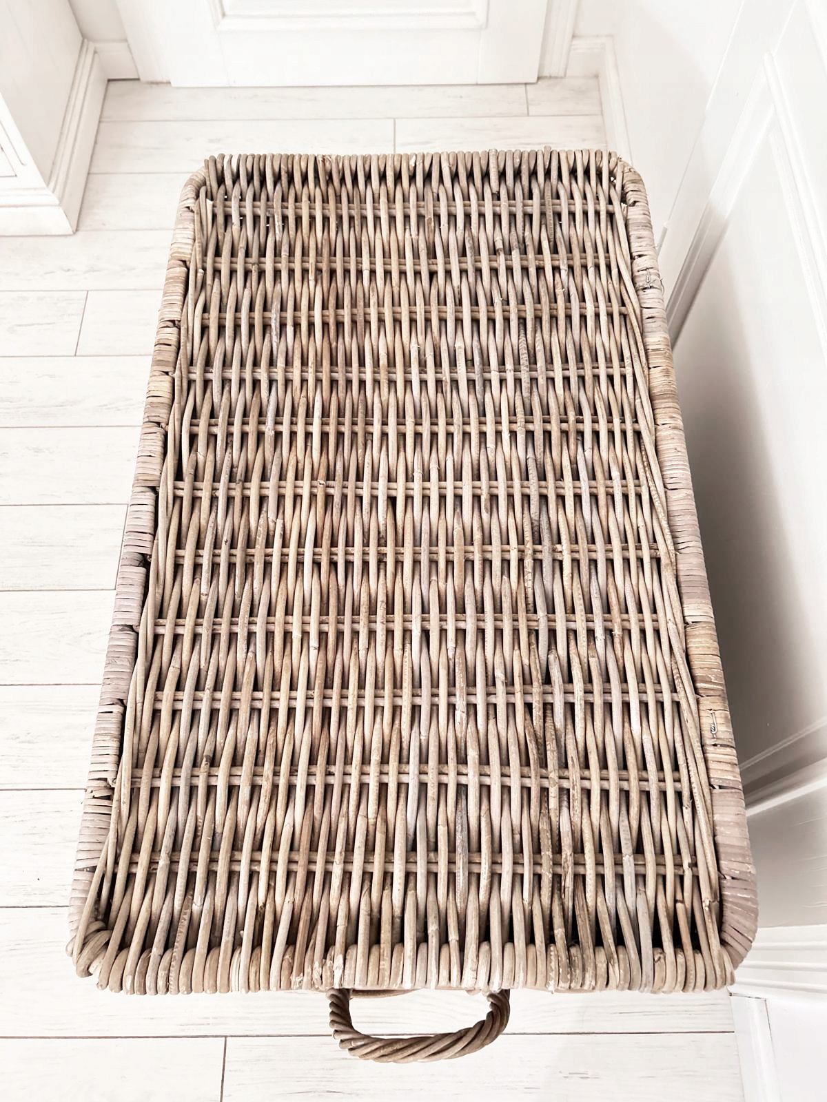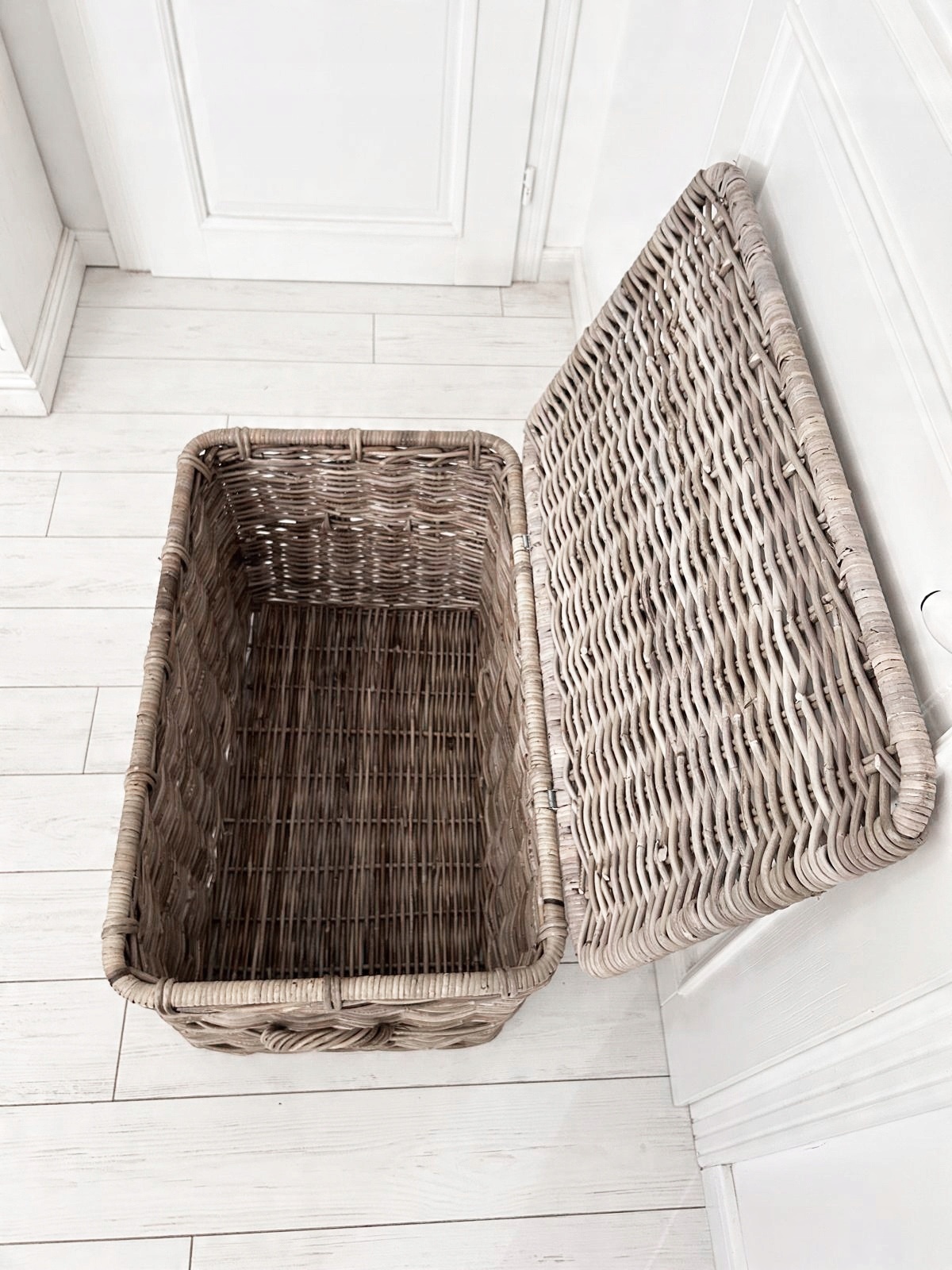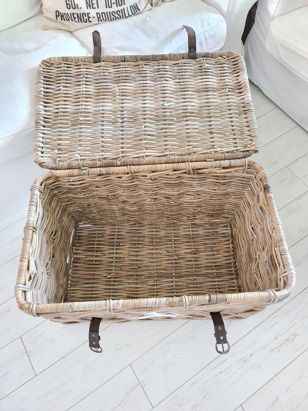 Сільська скриня, кошик, контейнер Hampton, виготовлений з ротанга з кришкою. Він має стабільний кадр, він ідеально підходить для зберігання ковдр, подушок, звичайно, його також можна використовувати для інших цілей. Він також ідеально знайдеться як багажник для іграшок у дитячій кімнаті або як ліжковий стіл у спальні. Зроблено вручну, пам’ятайте, що це природний продукт, а колір може бути трохи . Кришка прикріплена двома петлями.