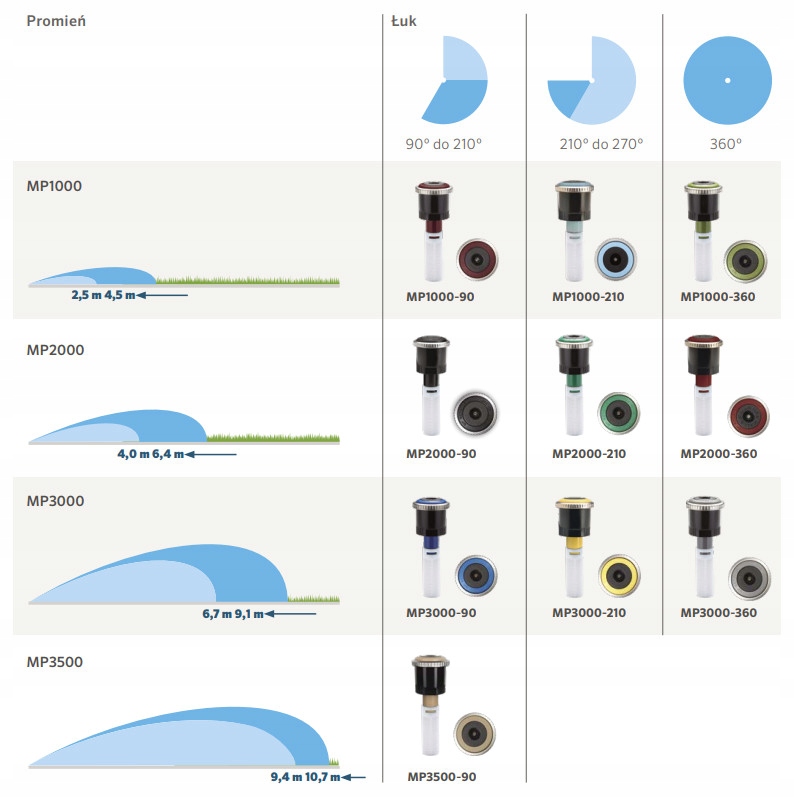 MP Ротаторні насадки є чудовим вибором у випадку нових систем, оскільки вони забезпечують велику гнучкість діапазону (радіус від 2,5 до 10,7 м), зменшують витрати на матеріали, а також підвищення ефективності систем. Вони також ідеально підходять для відновлення старих систем - їх модернізація може вирішити проблеми як низького тиску, так і поганого покриття.