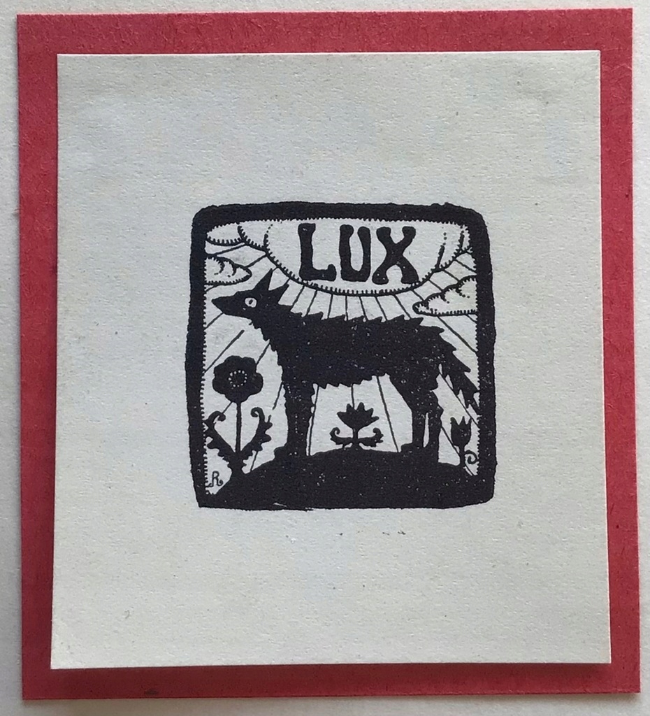 Rouba ekslibris z napisem Lux z wilkiem exlibris sygnowany ołówkiem
