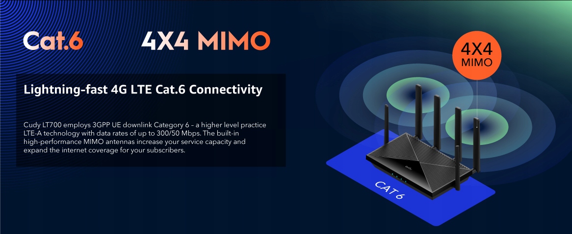 Маршрутизатор Cudy LT700 дозволяє завантажувати дані за технологією LTE на LTE FDD зі швидкістю до 300 Мбіт/с завдяки 4 антенам MIMO. Це означає блискавичне завантаження веб-сайтів, комфортний перегляд відео в Інтернеті або прослуховування музики через потокові сервіси. Файли завантажаться миттєво. Тому це ідеальний пристрій не тільки для домашнього використання, але і для компаній середнього розміру. Пристрій дозволяє підключити ще 3 пристрої за допомогою стандартного порту Gigabit LAN і модем або інший пристрій за допомогою порту LAN / WAN. Ця функція ідеальна, якщо ви часто працюєте в полі і вам потрібно забезпечити мобільний доступ до Інтернету для кількох пристроїв одночасно.