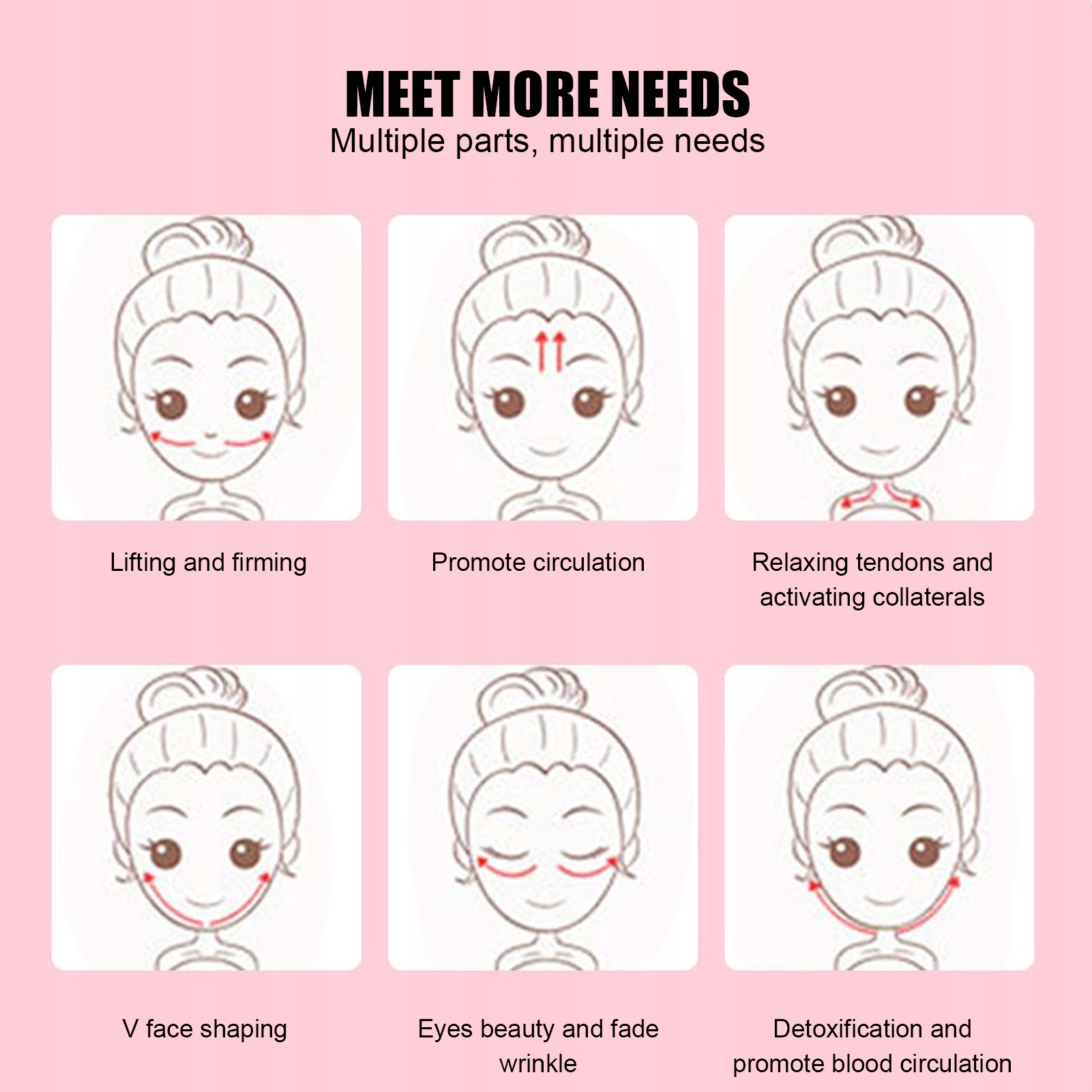5. Підвищення та запуску шкіри, нанизування обличчя, допомагають видалити зморшки для очей, зменшити тіні та покращити мішки.