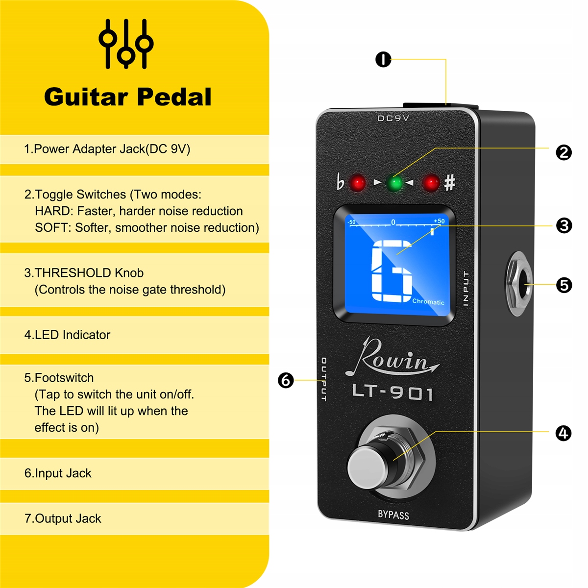 Rowin LT-901 Тюнер гітарного тюнера Ефект міні-хроматичний хроматичний обхід РК-дисплей цифрові аксесуари для деталей гітарної гітарі