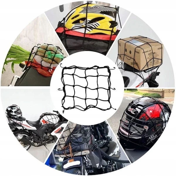 Гумова сітка з гачками для транспортування багажу під час їзди на мотоциклі, велосипеді чи скутері. Ідеальне рішення для транспортування чи зберігання шолома, рюкзака чи покупок.