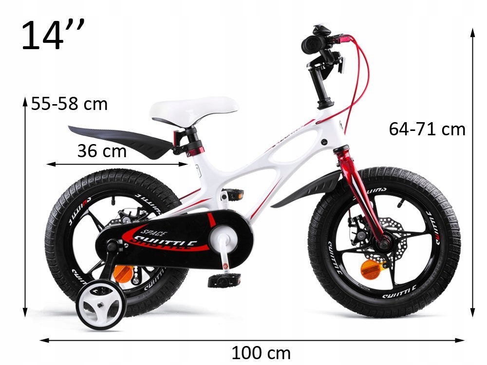 Велосипед авторитетної компанії Royal Baby Space Shuttle 14" -це перший високоякісний велосипед для аматора з двох коліс, що ідеально підходить для реального водія. магній, світлова рама з вигнутою поверхнею та гладкими лініями. Регульоване кермо професійно профільоване з безпечними гумовими перемикачами, із закритою кришкою регулювання, дзвоном та світловідбиваючим світлом. комфортні, сідло, 14 -дюймові колеса високоякісна шина, подвійна безпечна гальмівна система з подвійними дисковими гальмами забезпечить комфортне та стабільне водіння. бічні колеса + застіблений пов'язка на голову забезпечення того, щоб на початку підтримувати рівновагу, щоб дитина навчилася швидше керувати автомобілем самостійно. Повна ланцюгова покриття, що захищає від травми та бруду. Компоненти хорошої якості, які не викликають проблем у використанні. Кольори та графіка, які знаходять розпізнавання в очах власника та колег з двору. Цей велосипед добре вишуканий, відстані між кермом, сідлом та педалями пропорційно зберігаються, що забезпечує плавне та комфортне водіння. MM