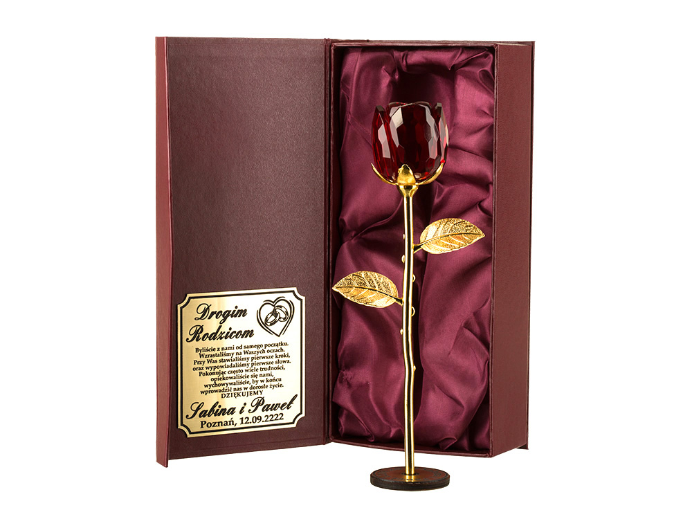 Красива подяка — виготовлена з бордового кришталю, огранена вручну та сформована троянда, прикріплена до пофарбованої золотом металевої ніжки з видно багато деталей. Додатково в набір входить вигравірувана підставка з присвятою, щоб троянда могла красиво виглядати на почесному місці в кожному домі. Доповнює все приголомшливий бордовий футляр із вигравіруваною присвятою, такої якості ви не знайдете більше ніде. Можу зробити для вас - ПОДАРУНОК НА БУДЬ-ЯКИЙ НАВОД (весілля, гостини, хрещення, причастя, день народження, вісімнадцяти іменини, ювілей, річниця весілля, день матері та батька, день дідуся та бабусі, день Святого Валентина, день вчителя, та ін.). b>