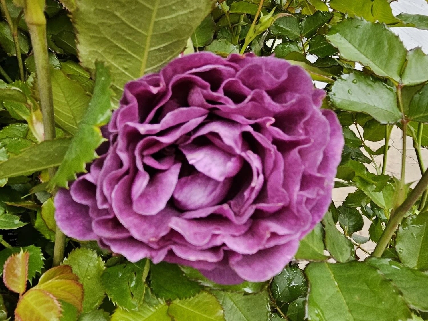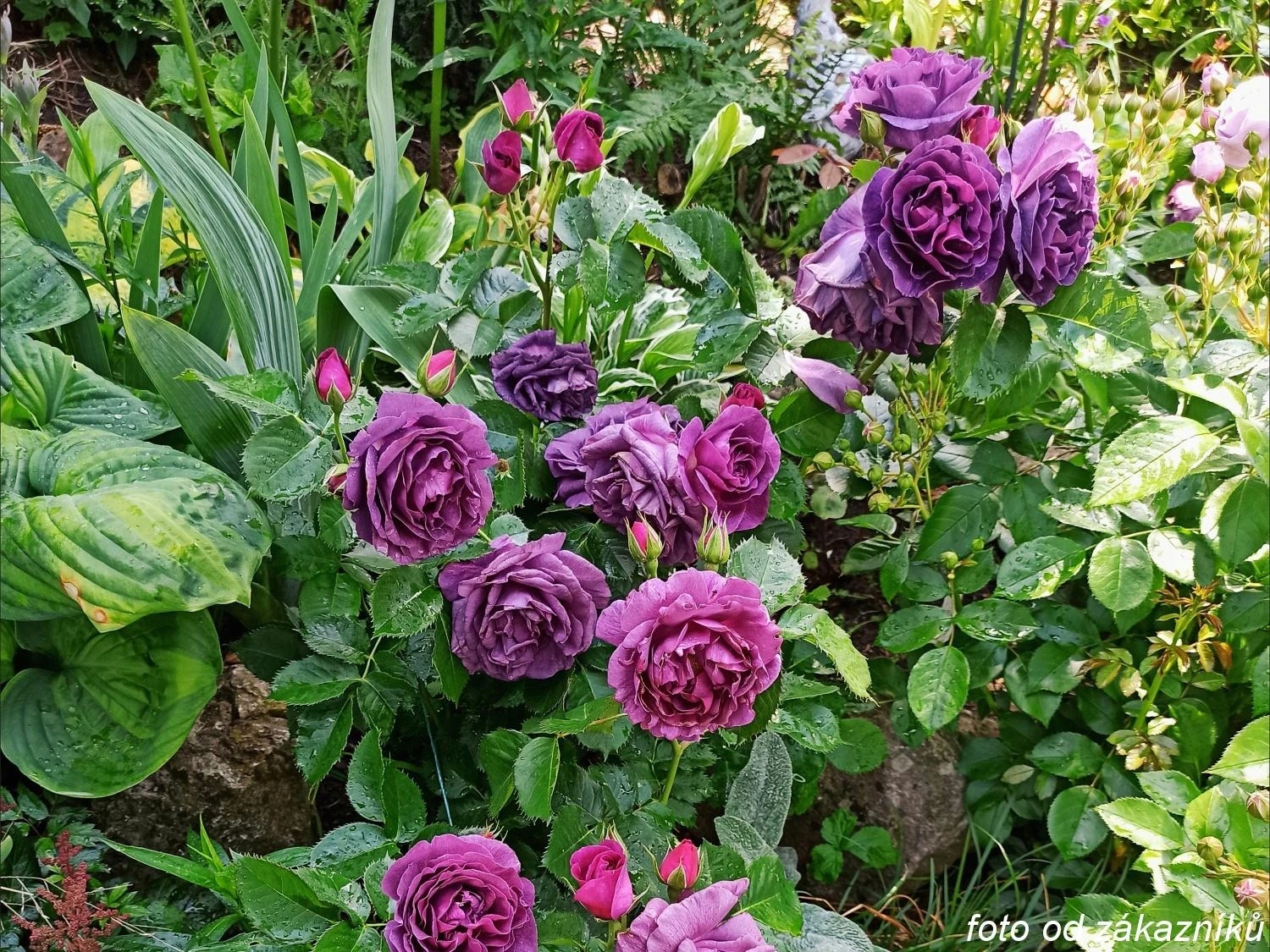 Троянда, щойно виросла, багатоквіткова, виростає у висоту 60-80 см. Суцвіття махрові, самі квітки мають діаметр 8-10 см і дуже цікавого забарвлення. У червні починають розкриватися чітко фіолетові або пурпурно-сині квітки.