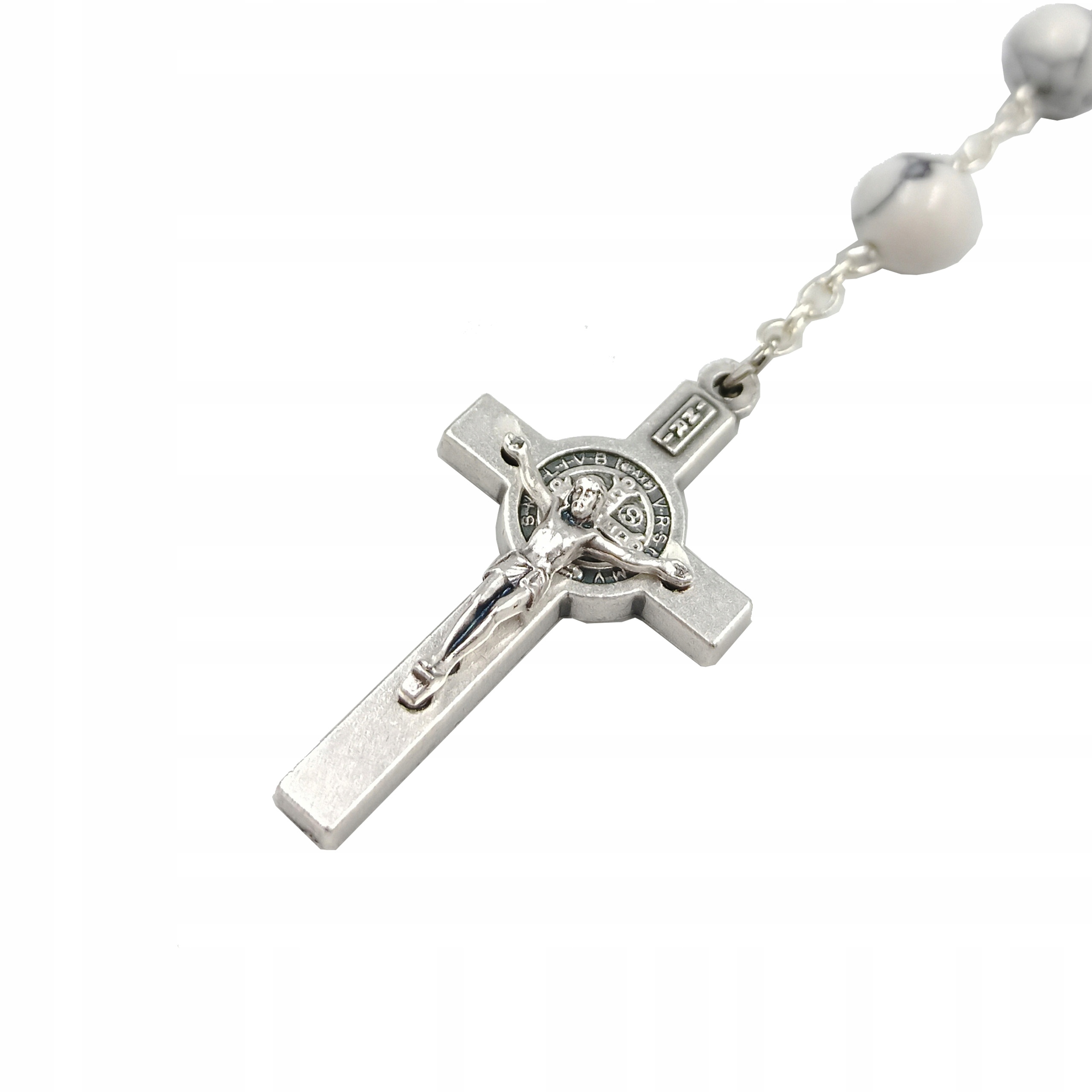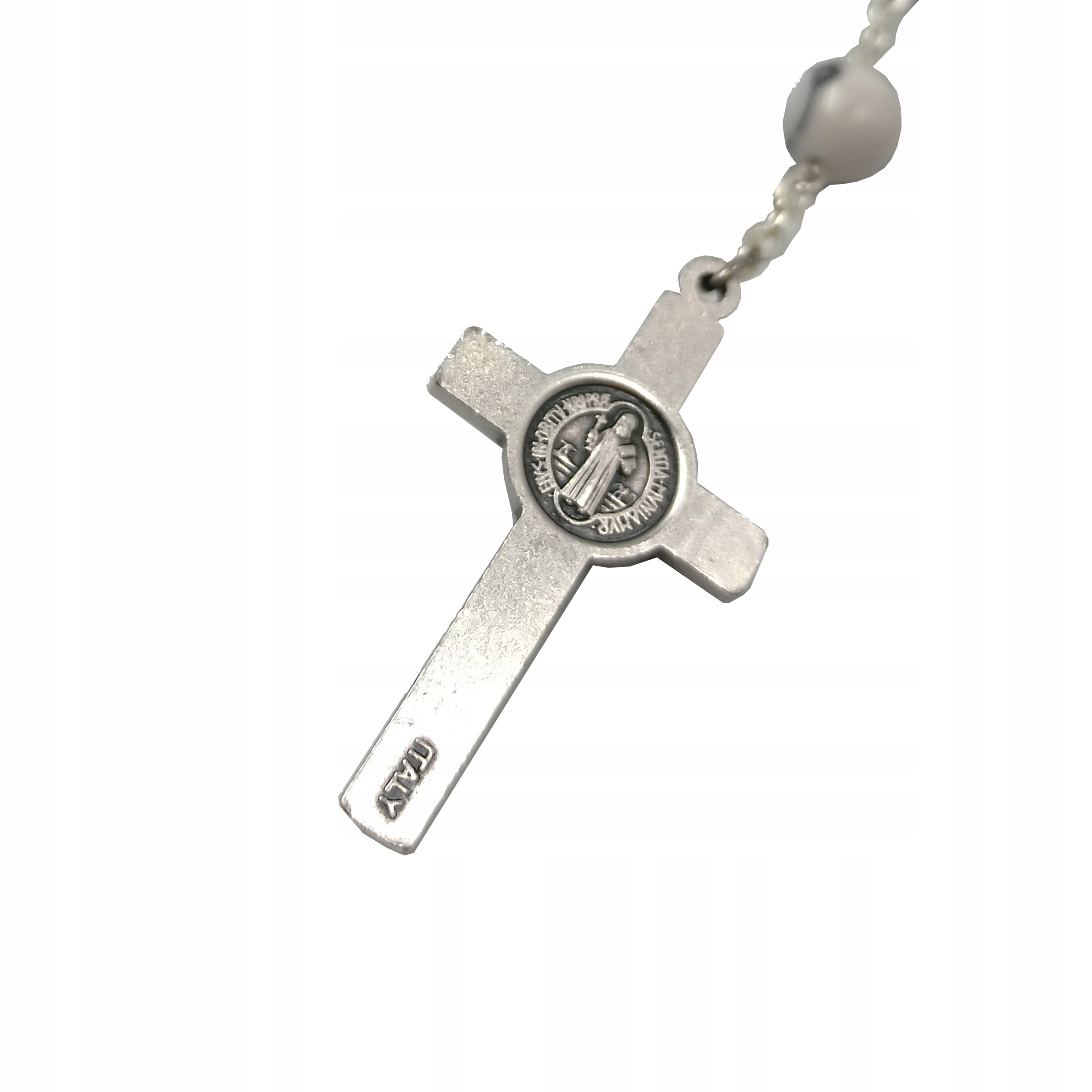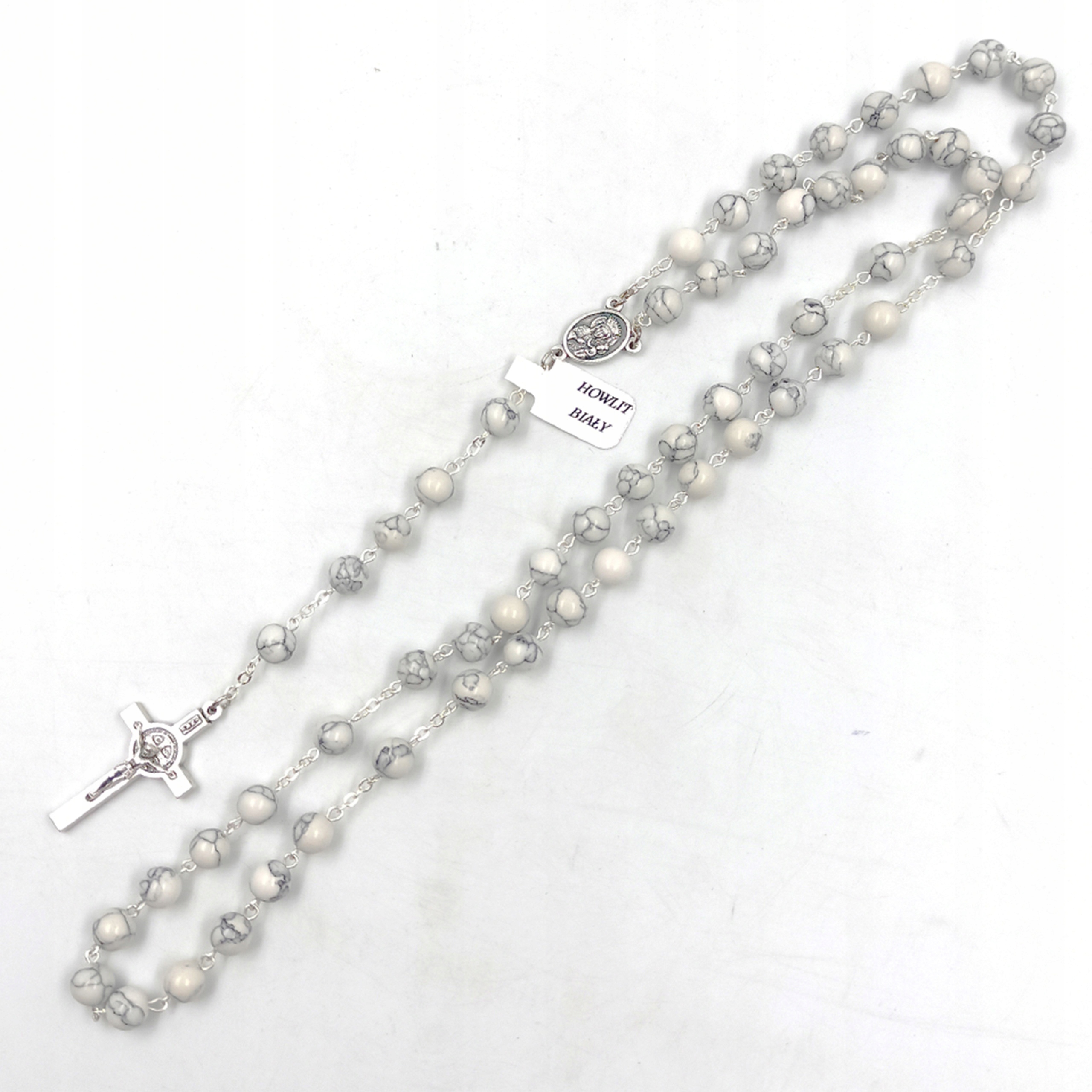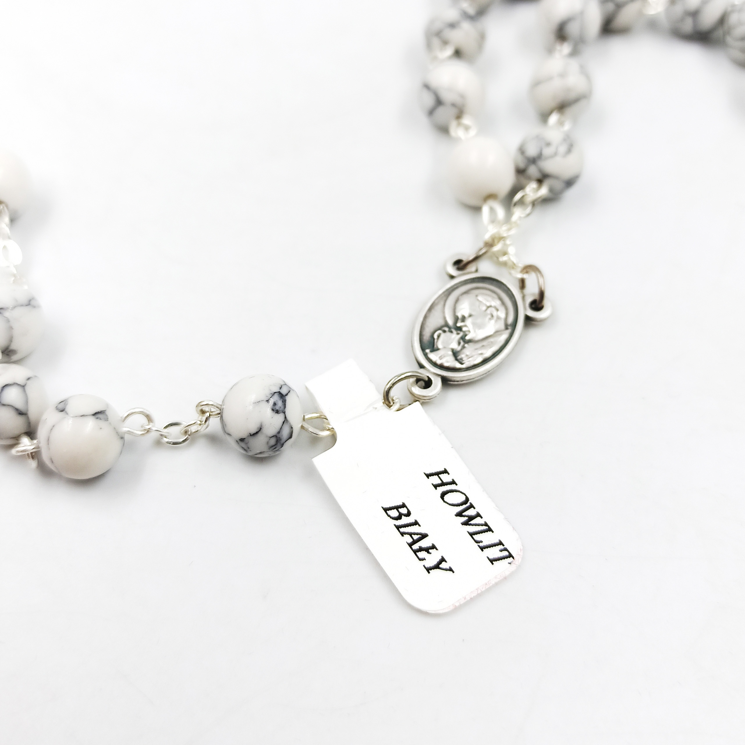 Представляємо унікальну вервицю польського виробництва, намистини якої виготовлені з феноменального природного каменю - гауліт білий. Решта елементів, як-от з’єднання, хрест і медальйон, були виготовлені з металу. Все виглядає солідно і надзвичайно акуратно.