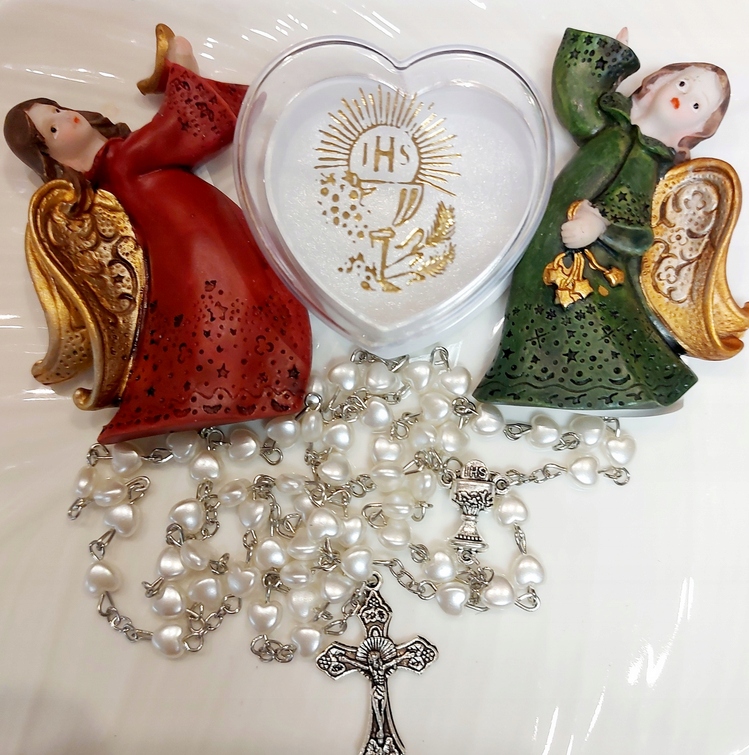 Перший -комунічний розарій у формі серця - рожева перлина єваріїст. Розарій - нерозлучний елемент цього прекрасного моменту. Продукт, який ми пропонуємо, ви будете ідеальними як сувенір протягом багатьох років, нагадуючи про цей важливий момент у житті. Медаль-конею зображує масову чашку з господарем. Доступний на нашому веб -сайті, перше розарій причастя стане чудовим подарунком, який відбиває цей піднесений момент у житті молодого католика.