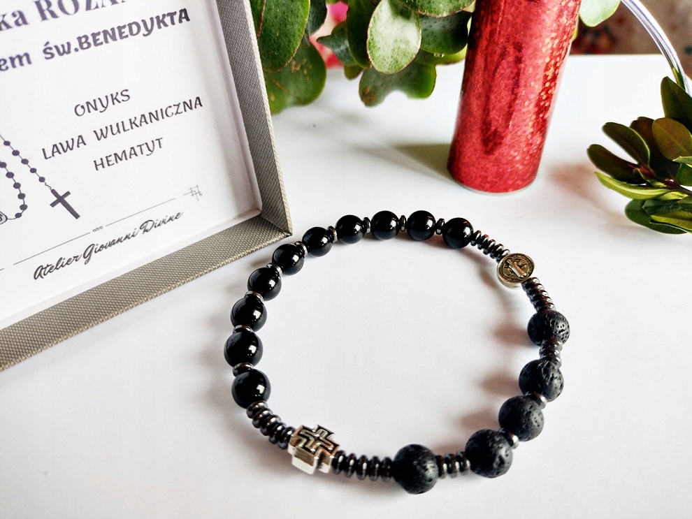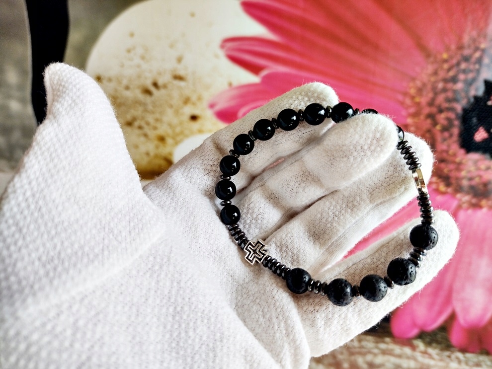 Браслет ручної роботи з натуральних каменів ОНІКС та ВУЛКАНІЧНА ЛАВА (діаметр кулі 8 мм), диски з b>ГЕМАТИТУ тахрест і медальйон св. Бенедиктнадітий на міцну ювелірну силіконову гумку.