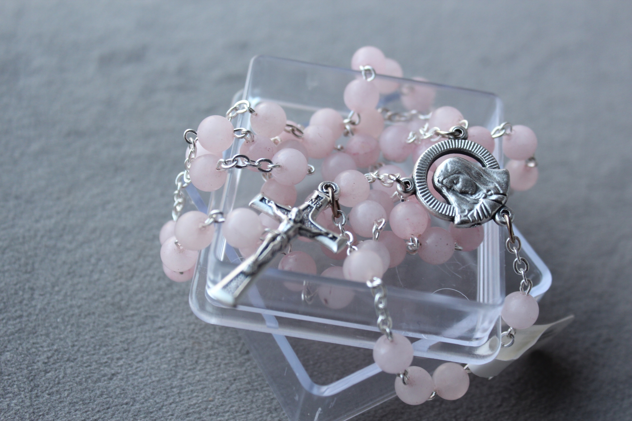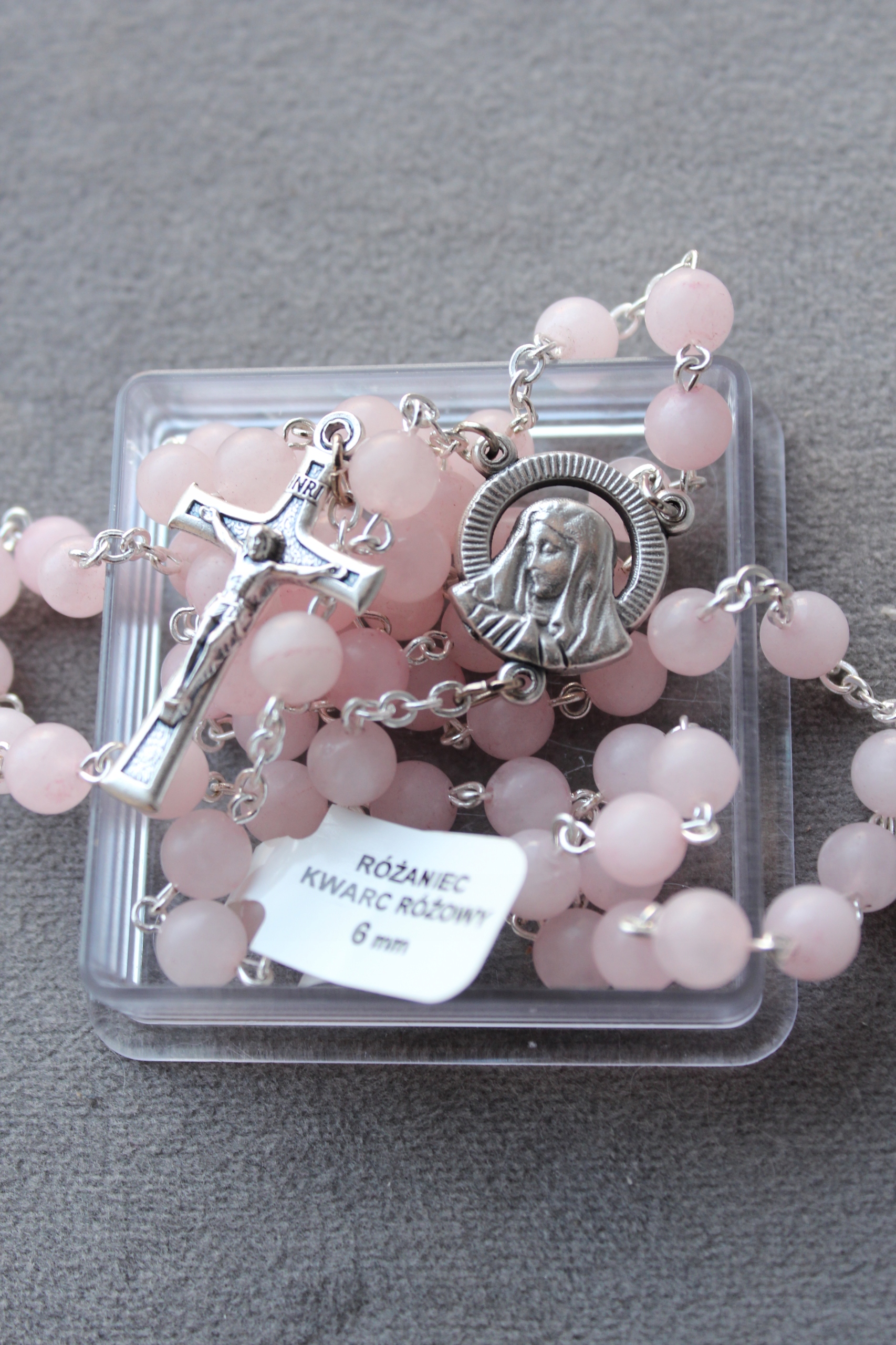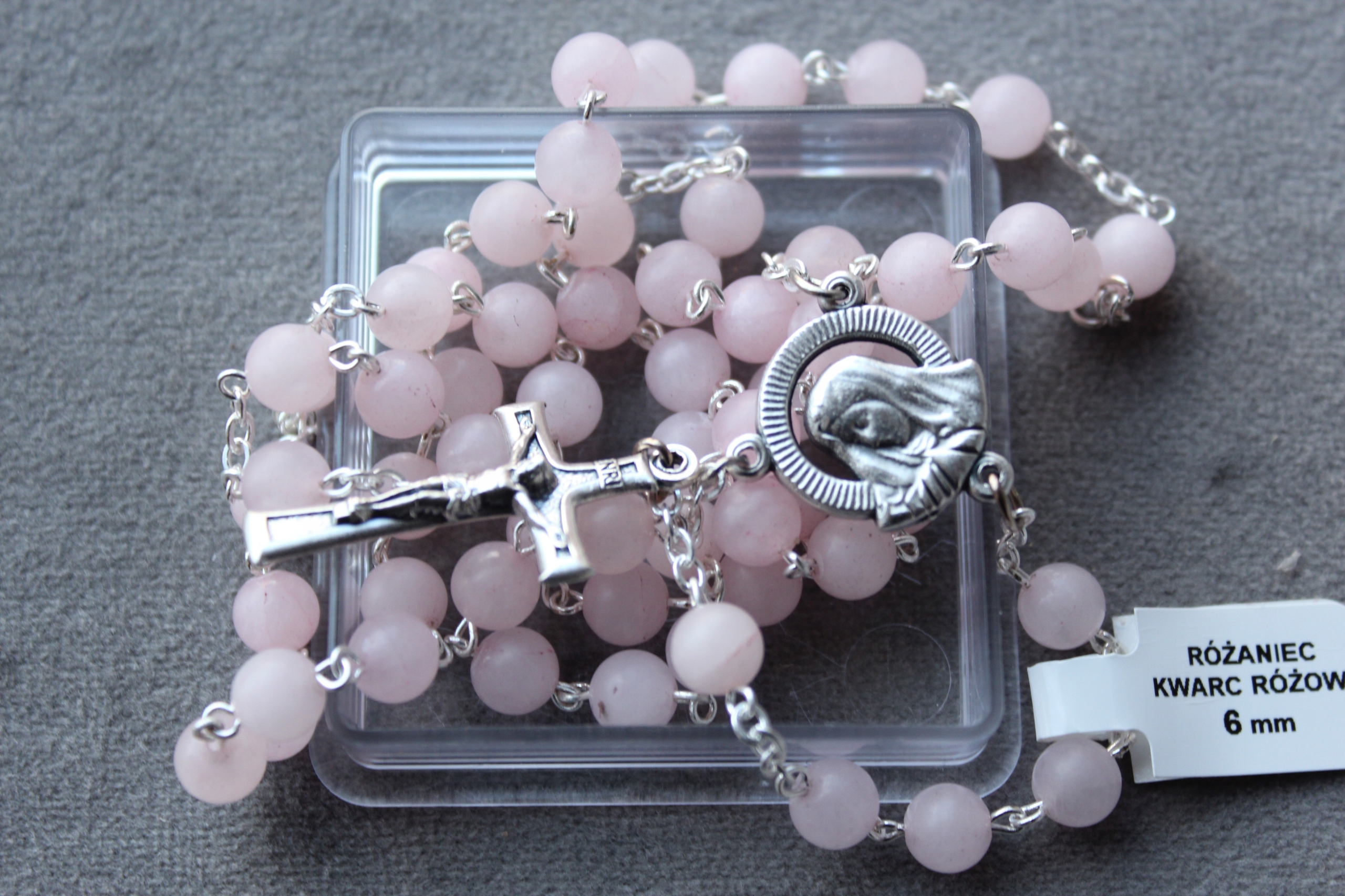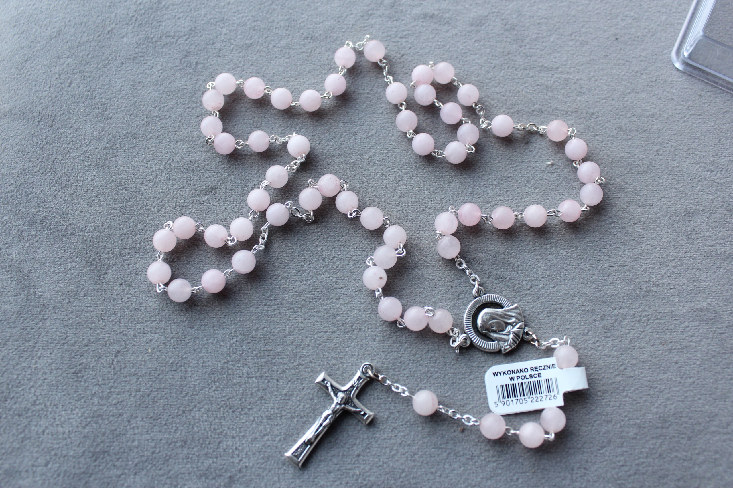 - Унікальний розарій ручної роботи в Польщі з натурального каміння рожевого кварцу.