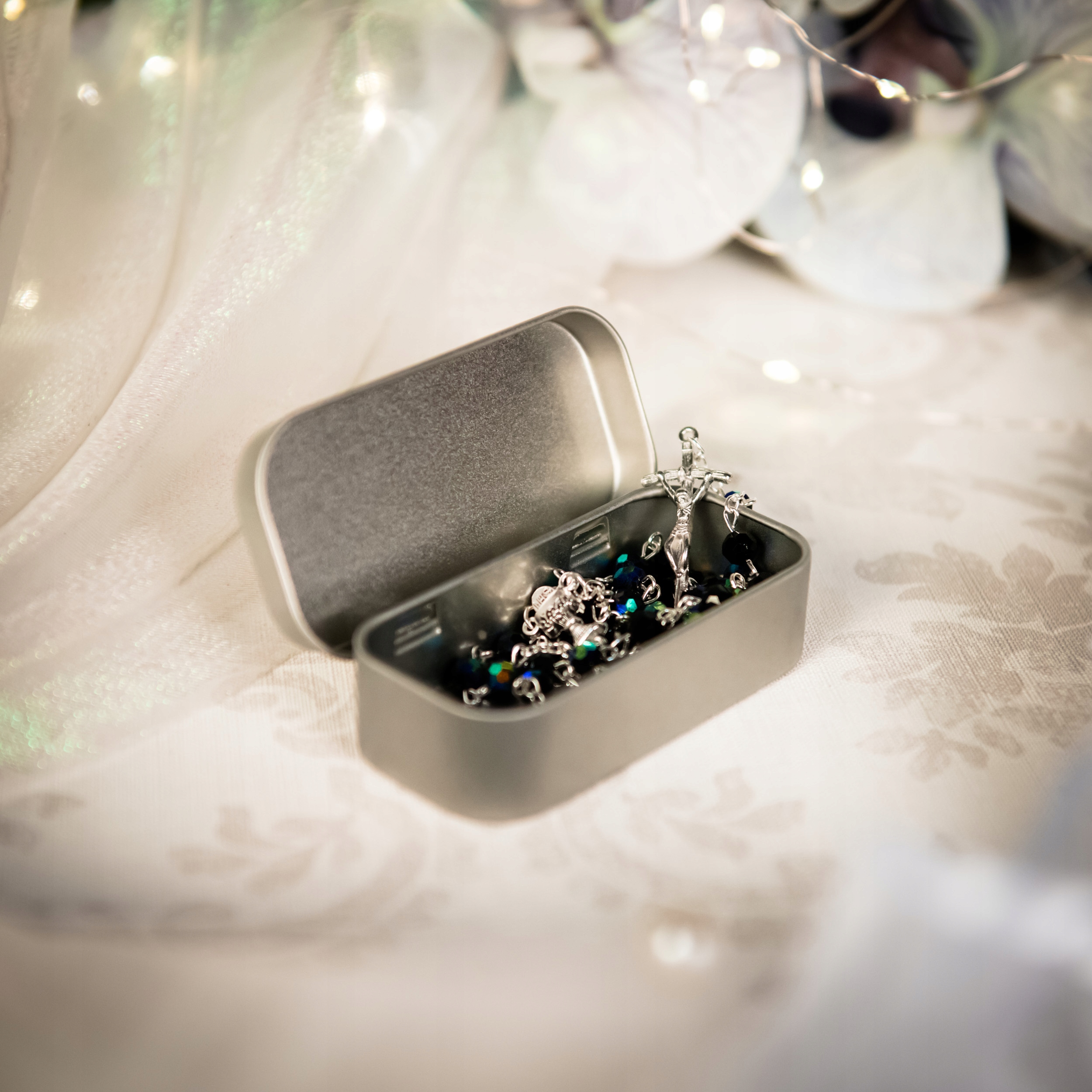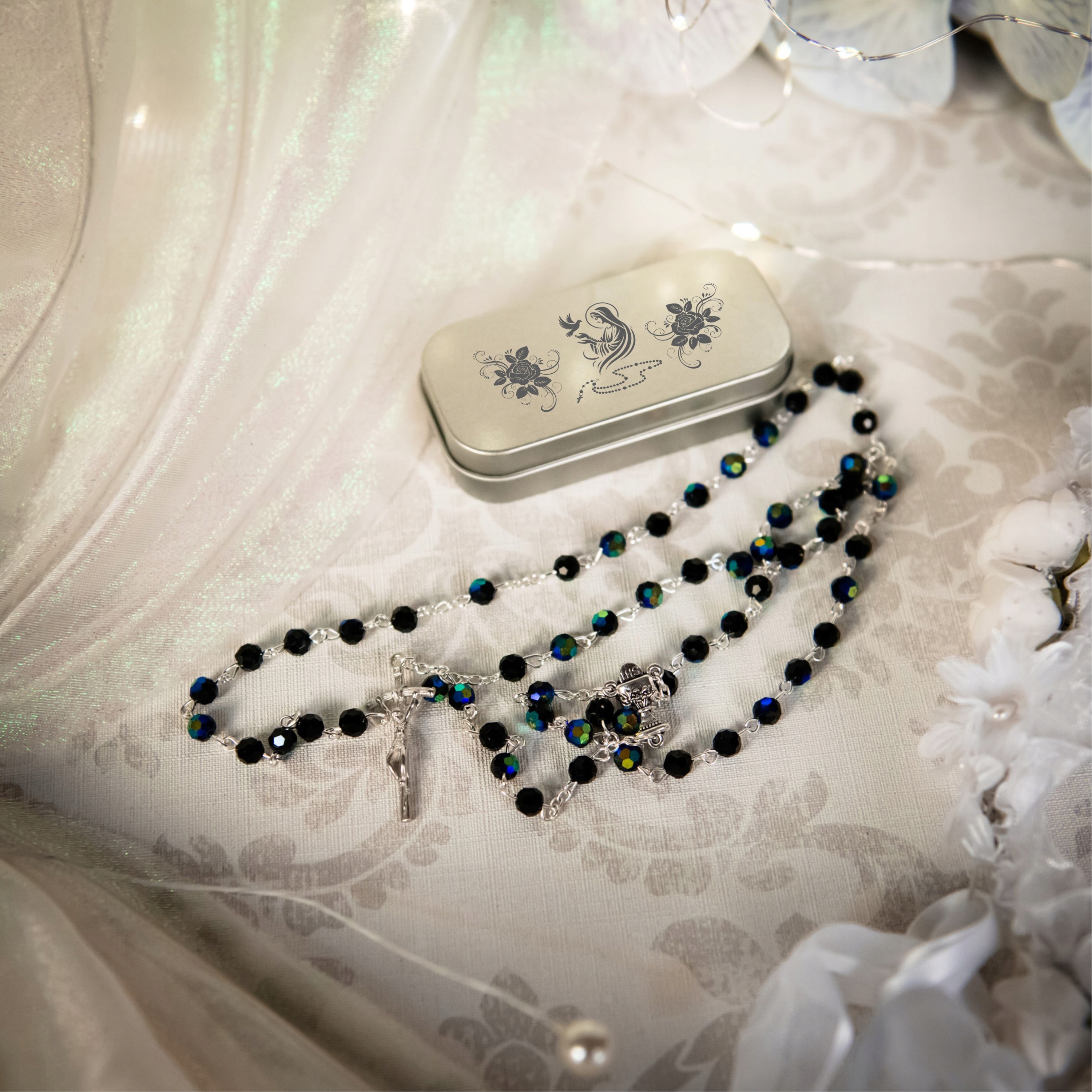 Четки виготовлені з опалесцентного чорного бісеру. До розарію входить срібна коробка з унікальним гравіюванням!