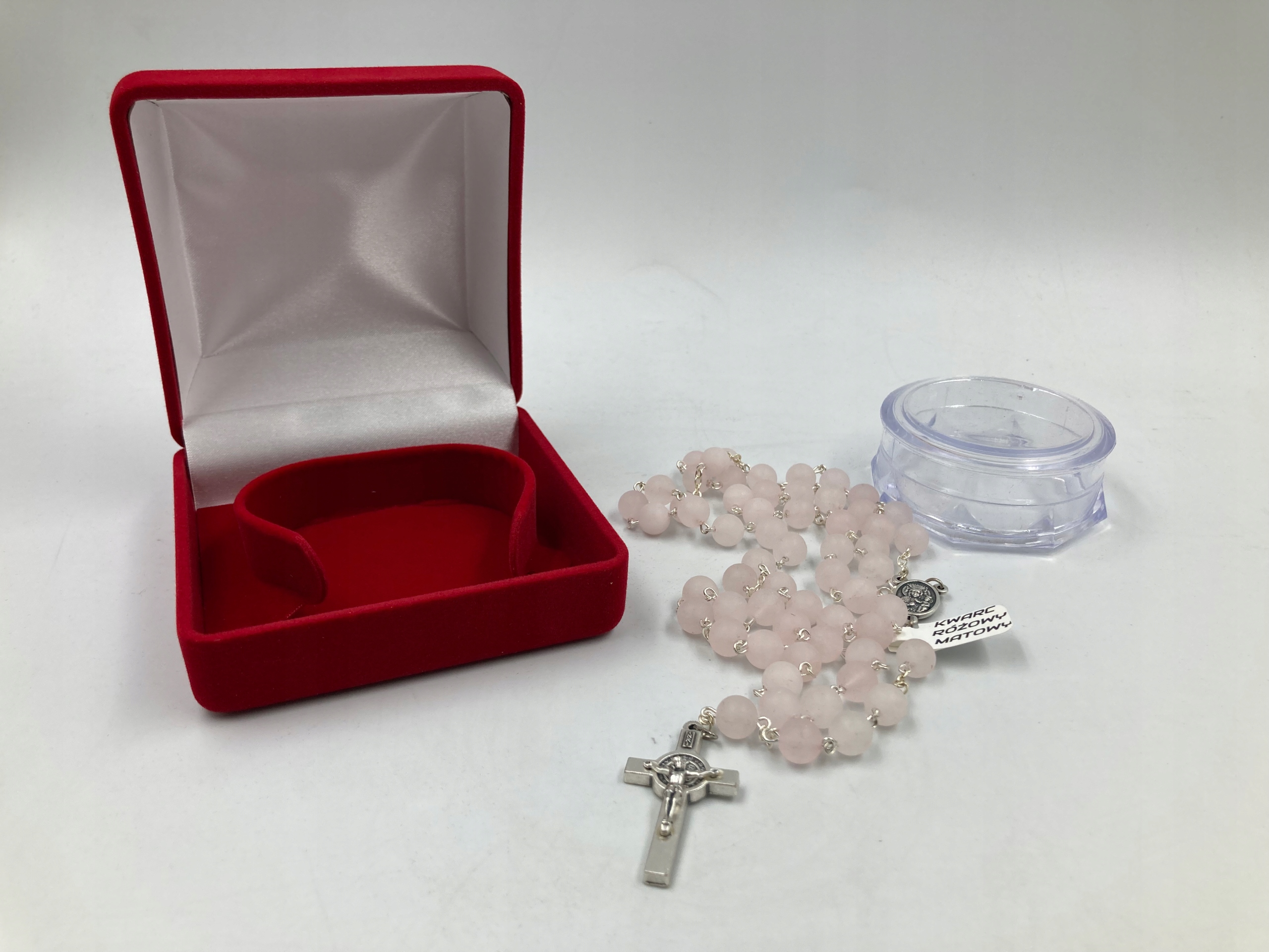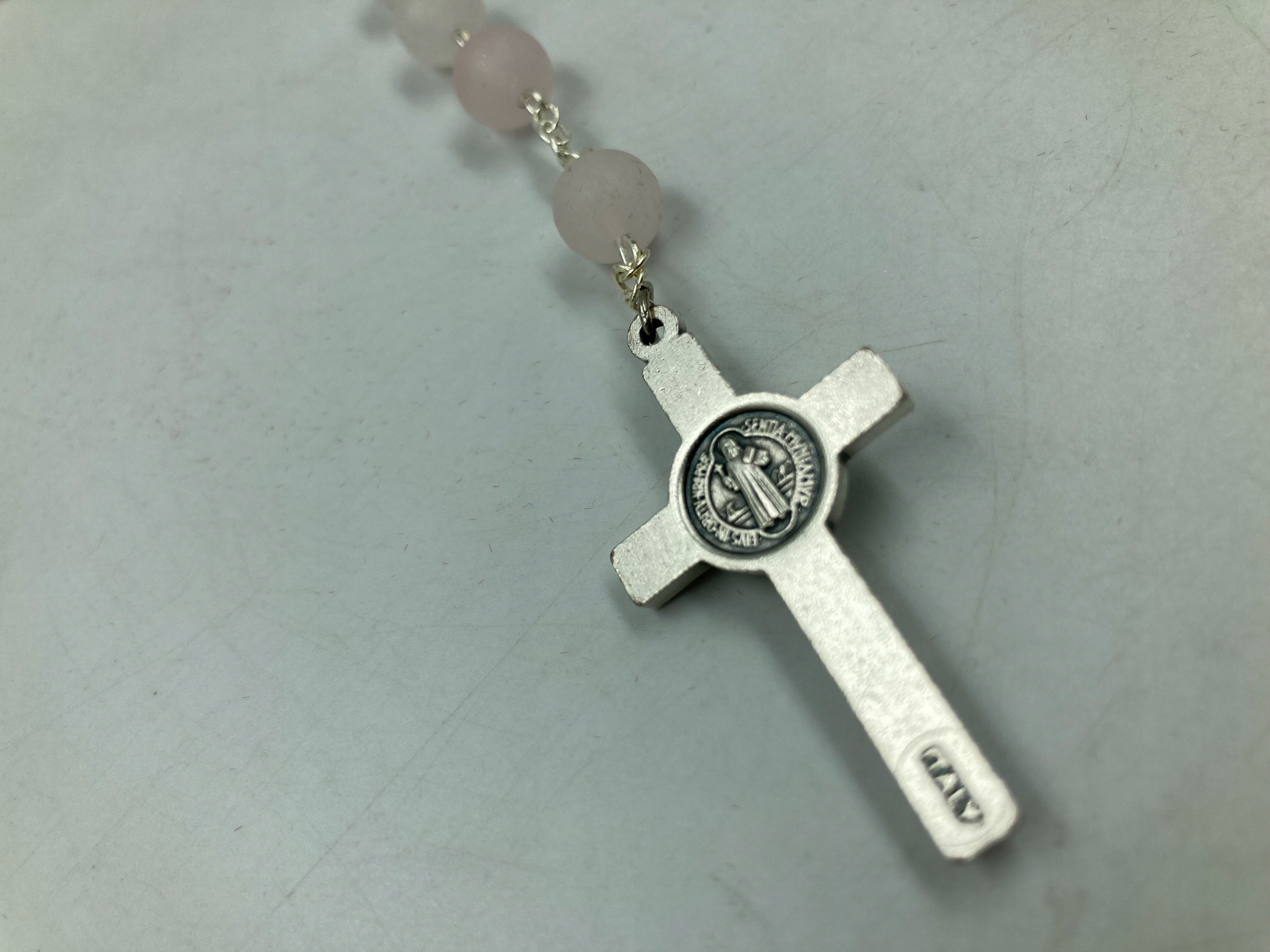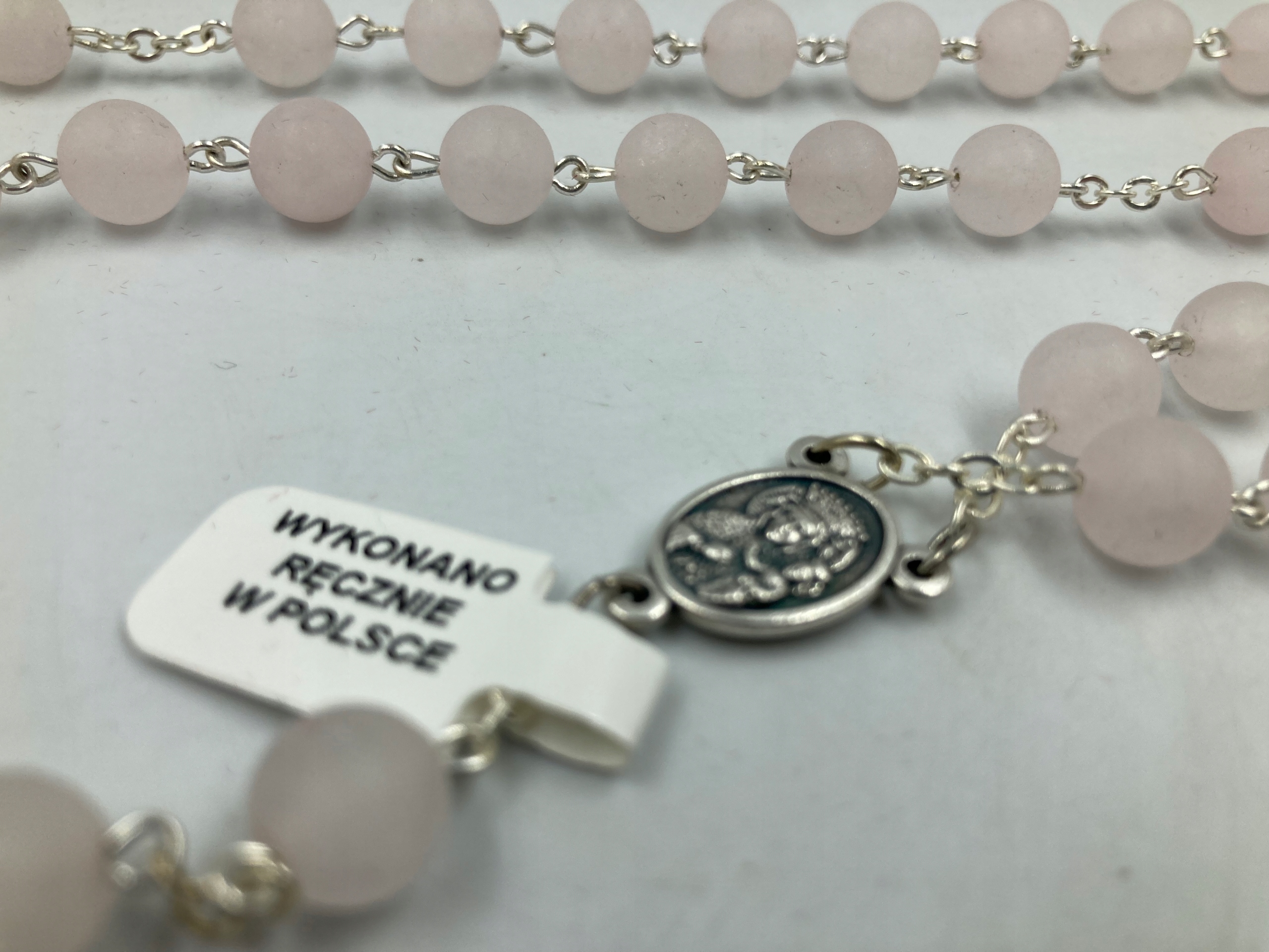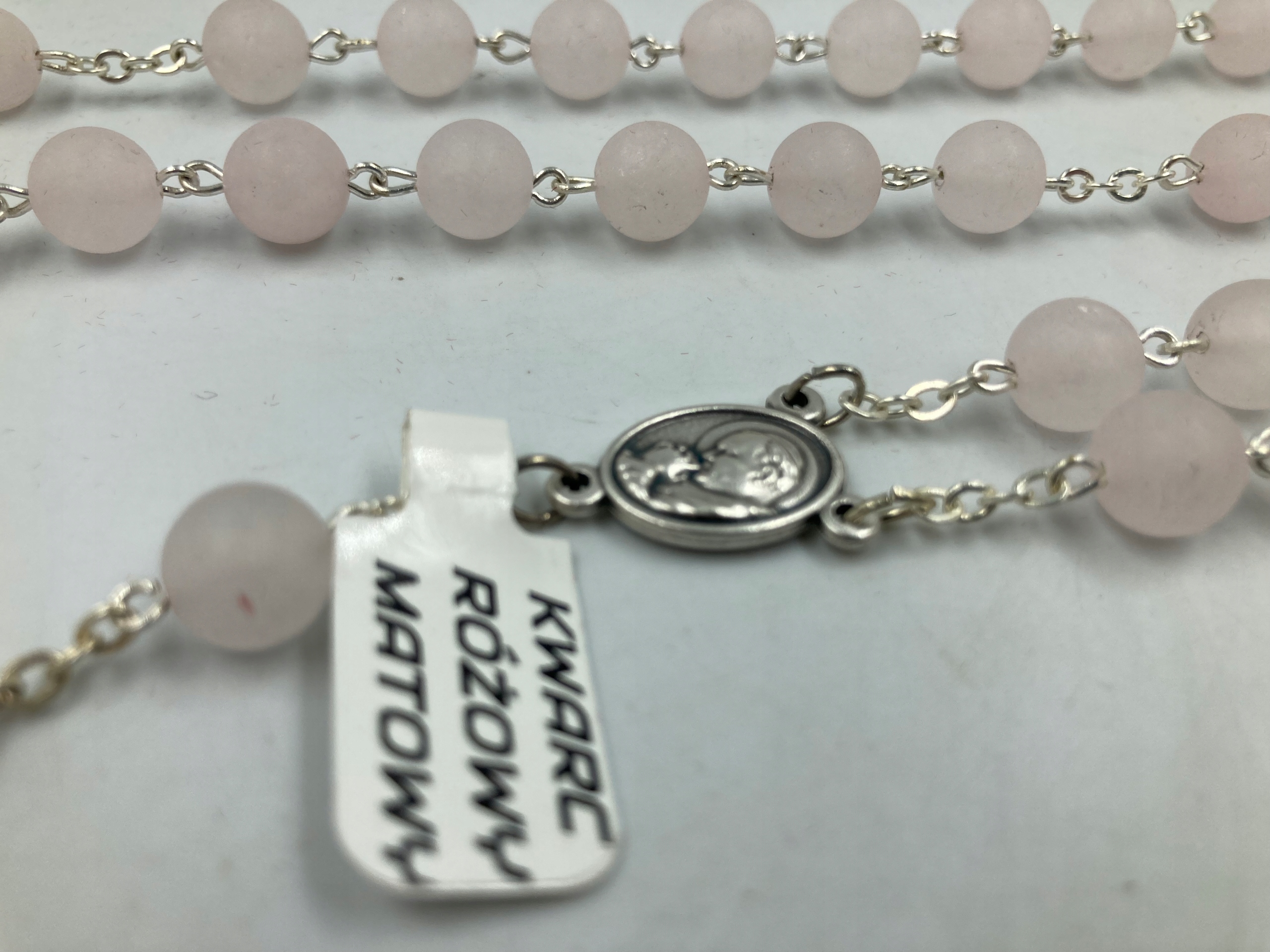 Представляємо унікальну вервицю польського виробництва, намистини якої виготовлені з феноменально красивого природного каменю - матового рожевого кварцу. Решта елементів, як-от з’єднання, хрест і медальйон, були виготовлені з металу. Все виглядає солідно і надзвичайно акуратно.