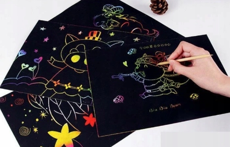 Забава полягає в тому, щоб подряпати чорну картку паличкою. Кожна дитина може нашкрябувати все, що забажає, створюючи унікальний малюнок. Кожна картка вкрита чорною фарбою, на якій, подряпавши, буде видно веселковий візерунок. Гра в скретч розвиває креативність. Він не обмежується конкретним малюнком, він дає багато можливостей.