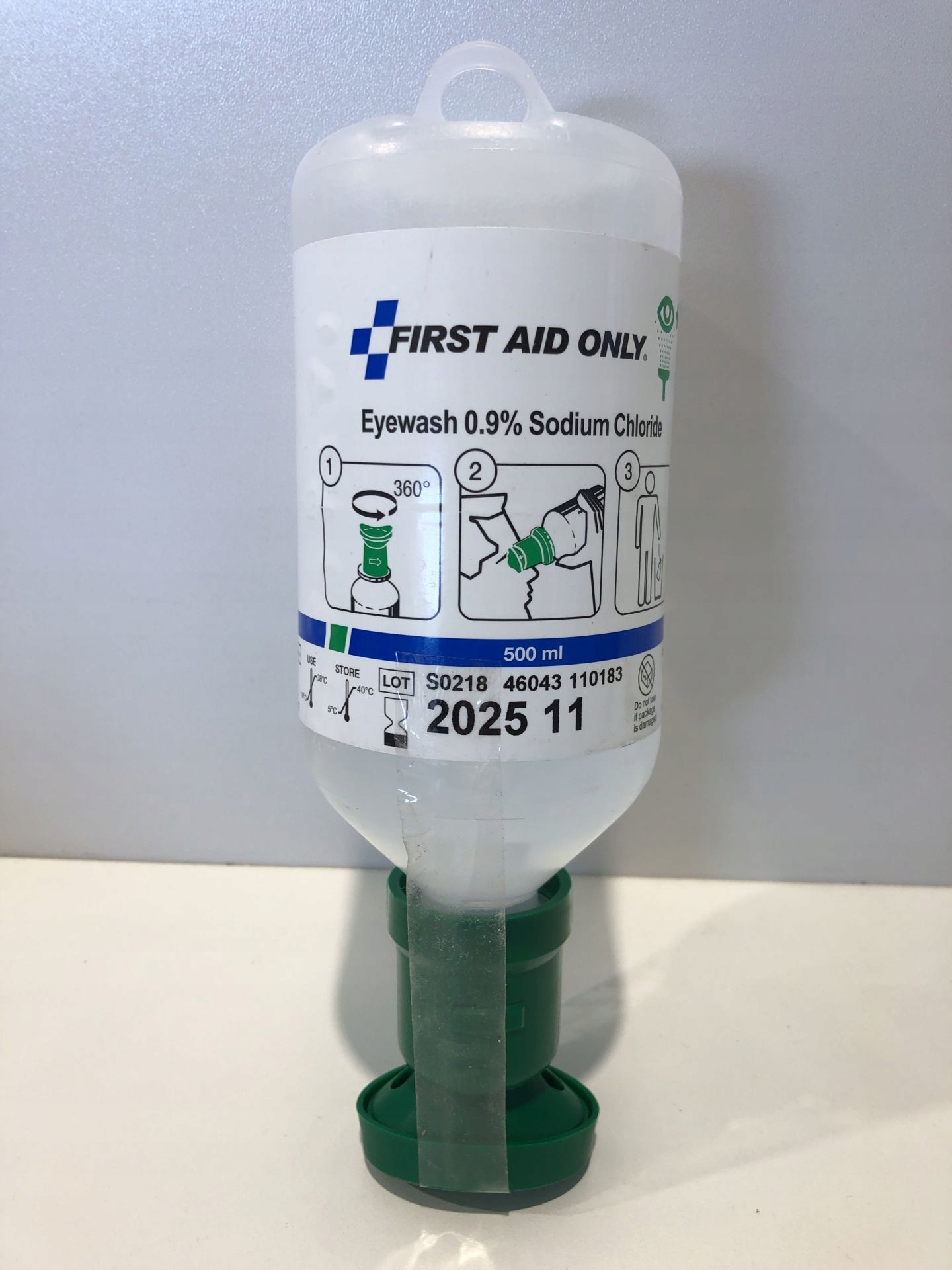 Індивідуальний флакон для промивання очей, що містить 500 мл добре переносимого розчину хлориду натрію (0,9%)