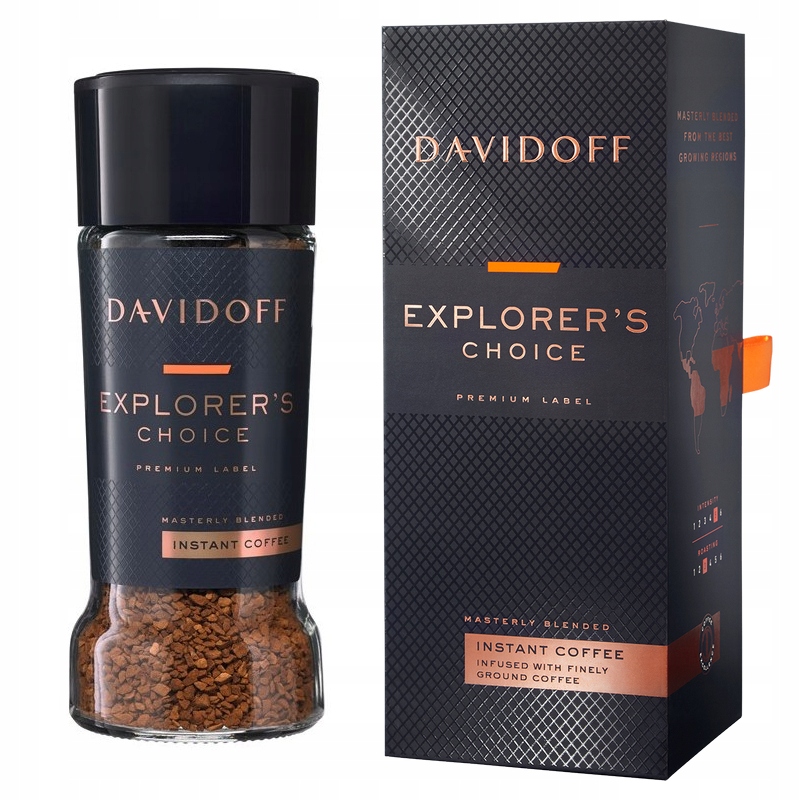 Розчинна кава Davidoff Explorer's Choice Premium Label — це ексклюзивна суміш, розроблена майстрами Davidoff із сублімованої розчинної кави (95%) з додаванням дрібно подрібнених колумбійських кавових зерен (5%) — вона збагачує цю розчинну суміш повною аромат і гармонійний смак з легкою ноткою шоколаду. Кава Explorer's Choice містить лише найкращі та найблагородніші зерна 100% арабіки з ретельно відібраних плантацій по всьому світу, завдяки чому ви відчуєте повний мультисенсорний досвід кави.