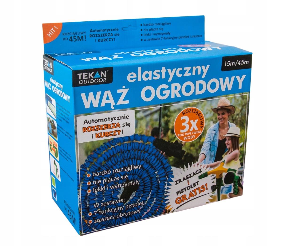 - Шланг в упаковці польської марки TEKAN виготовлений з високоякісної поліестерової стрічки, латексу та ABS пластику.