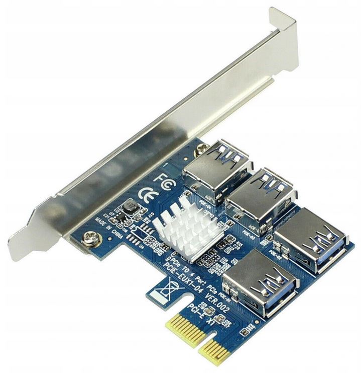 - Адаптер, завдяки якому один PCI-E слот може використовуватися 4 відеокартами, підключеними через райзер. Цей продукт може вирішити проблему відсутності інтерфейсу PCI-E на материнській платі.