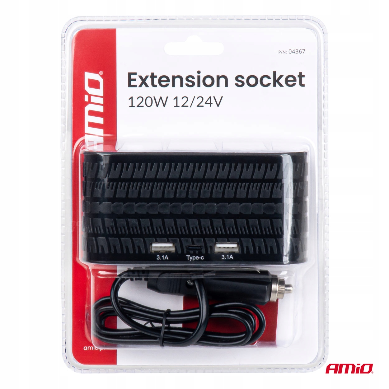 Розгалужувач гнізда прикурювача із зарядним пристроєм 2x USB-A 1x USB-C 12V 24V 120W 80cm AMIO-04367
