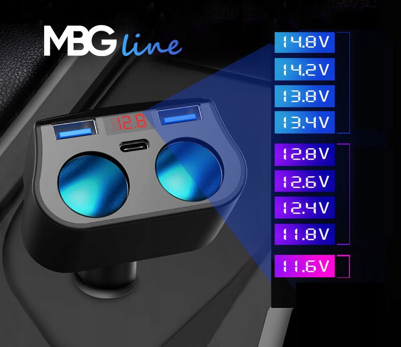 СУЧАСНИЙ РОЗДІЛЬНИК ЗАПАЛЮВАЧКИ 2XUSB QC3.0+ 2 ГНІЗДА ЗАПАЛЮВАЧКИ + 1X USB TYPE C PD 20W - МАКС. 120W + ВОЛЬТМЕТР + КАБЕЛЬ USB-C