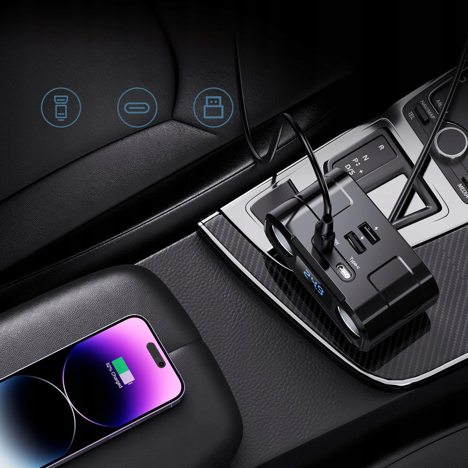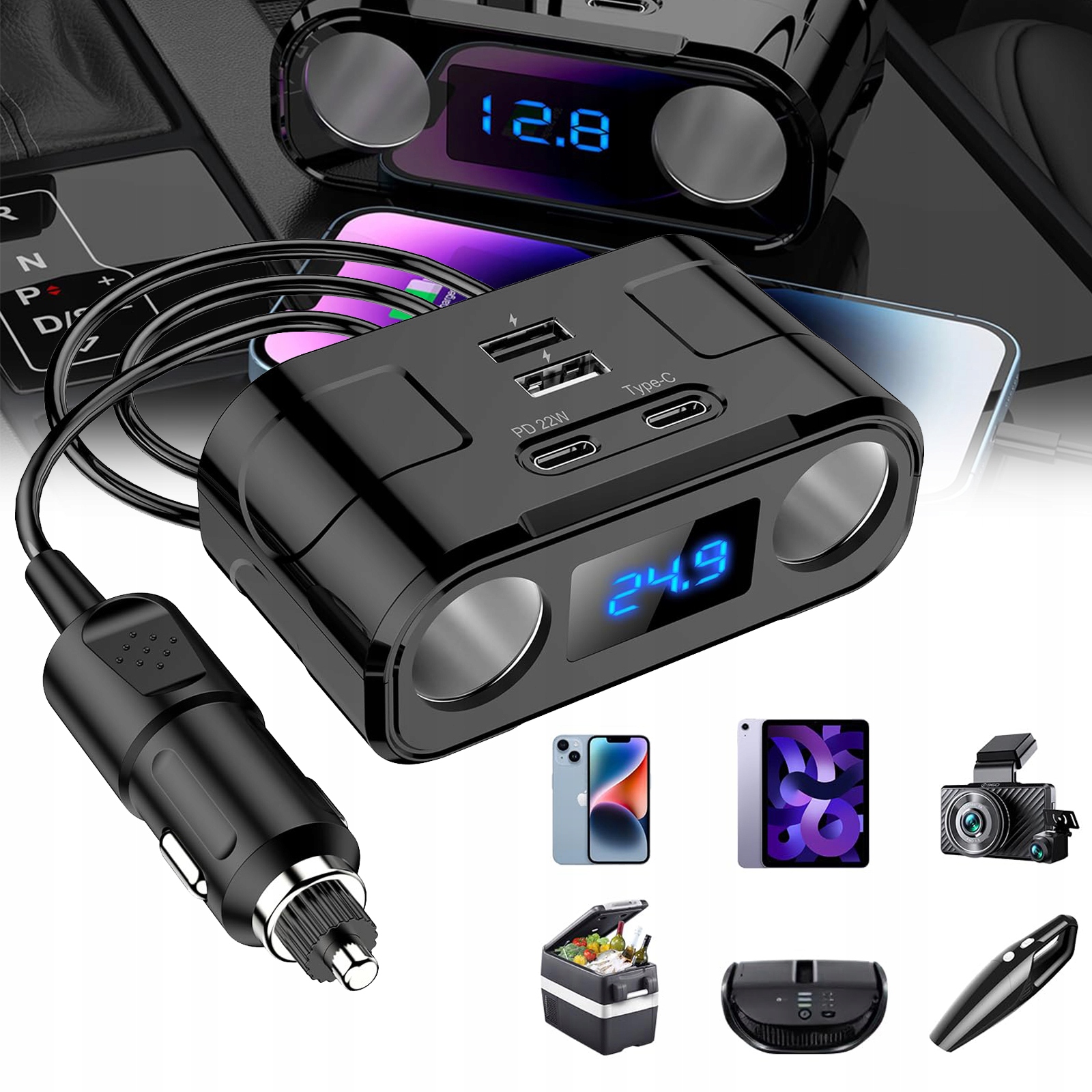 РОЗДІЛЮВАЧ ГНІЗДІВ для АВТОМОБІЛЬНОЇ ПРИПАЛЮВАЛКИ з 2 USB та 2 USB-C PD