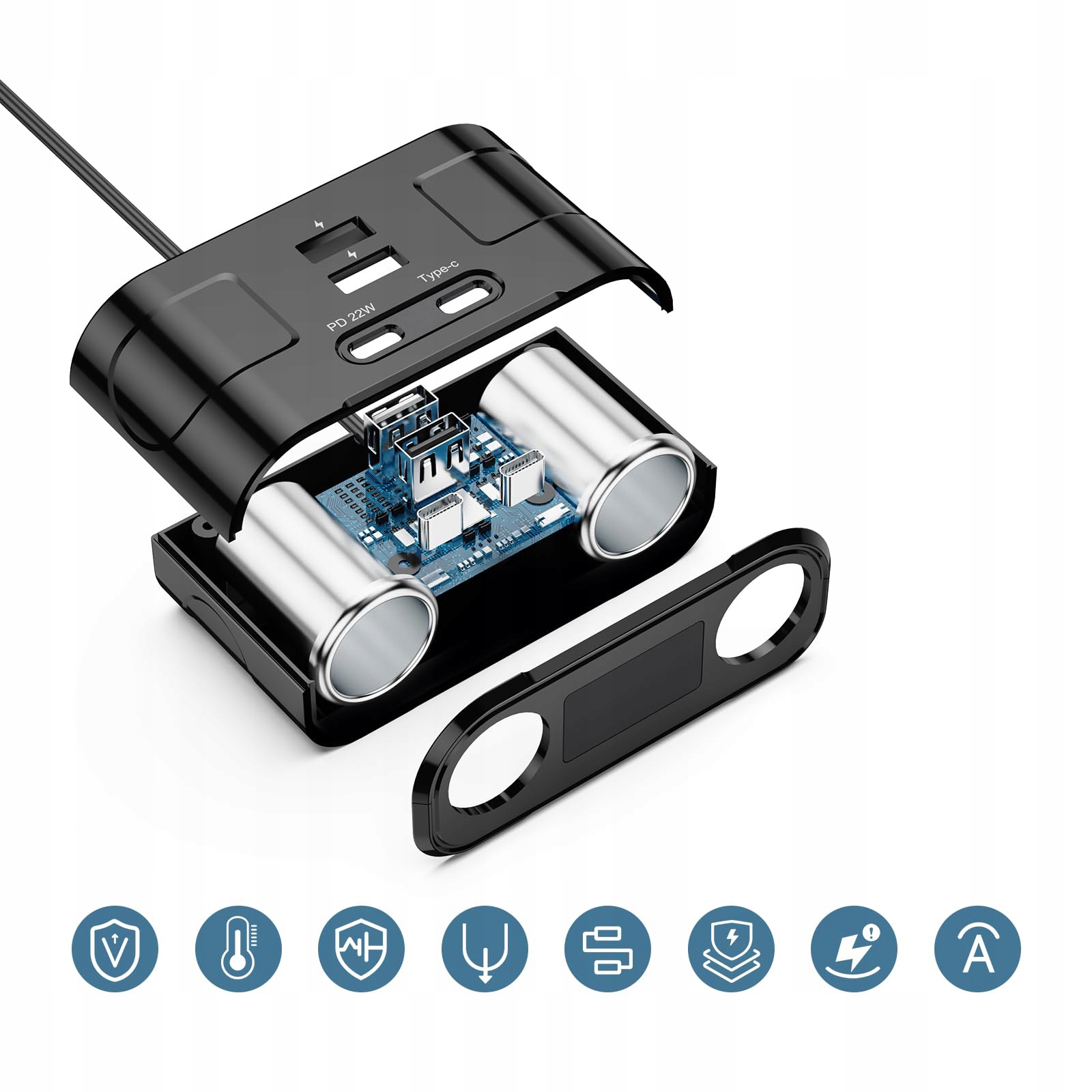 Автомобільний зарядний пристрій оснащено інтелектуальним і точним цифровим дисплеєм, який відображає інформацію про напругу в реальному часі. Ви можете контролювати рівні напруги та забезпечувати стабільність заряджання, забезпечуючи спокій під час подорожі. Цей зарядний пристрій-розгалужувач автомобільного прикурювача має кілька засобів захисту, включаючи захист від перевантаження, захист від перевантаження по струму, захист від перенапруги, захист від перегріву, захист від короткого замикання, захист від низької напруги, захист від зворотного підключення та захист від електромагнітного випромінювання. Ці засоби захисту забезпечують надійне та безпечне заряджання пристроїв.